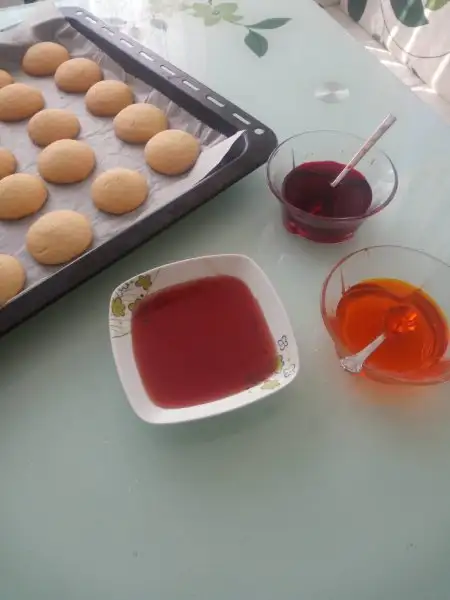 Arasına marmelat çikolata fındık kreması istediğinizi surebilirsiniz ben çilek marmelati kullandım iki kurabiyeyi birleştiriyoruzsonra gıda boyalarina batırıp çıkarıp havlu kagidin üzerine koyiyorz az kurulayinca daha hoş oluyor