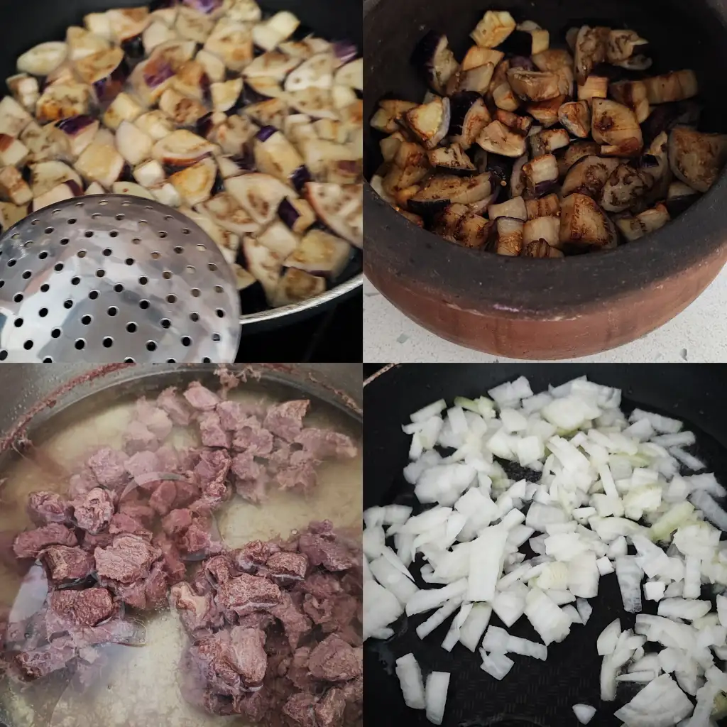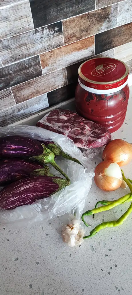 Patlıcanları kızartıp kenara alıyoruz. Soğan, biber ve sarımsağı küçük küçük doğruyoruz.