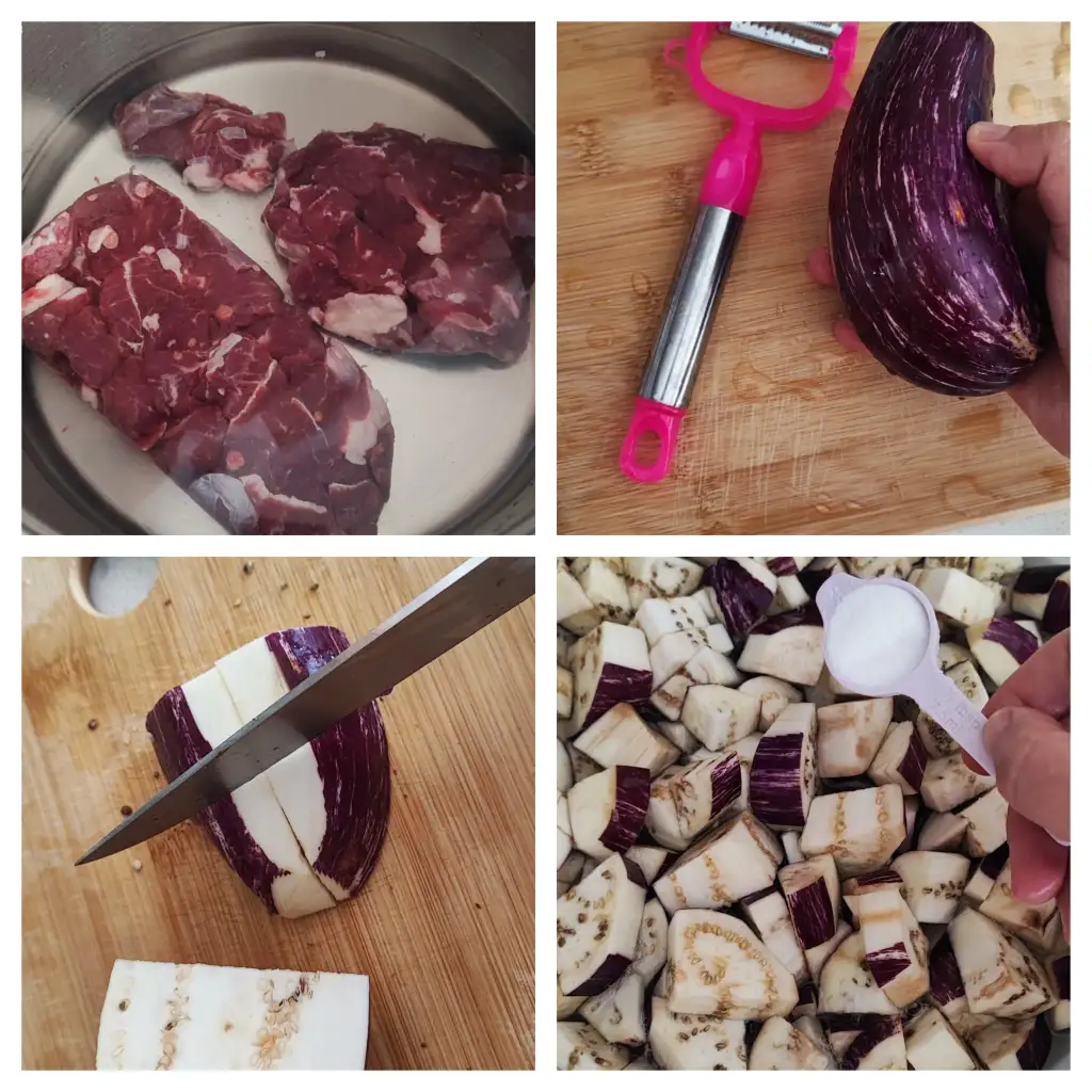 Etler haşlanırken patlıcanları alacalı soyup küçük küçük doğruyor ve tuzlu suda bekletiyoruz.