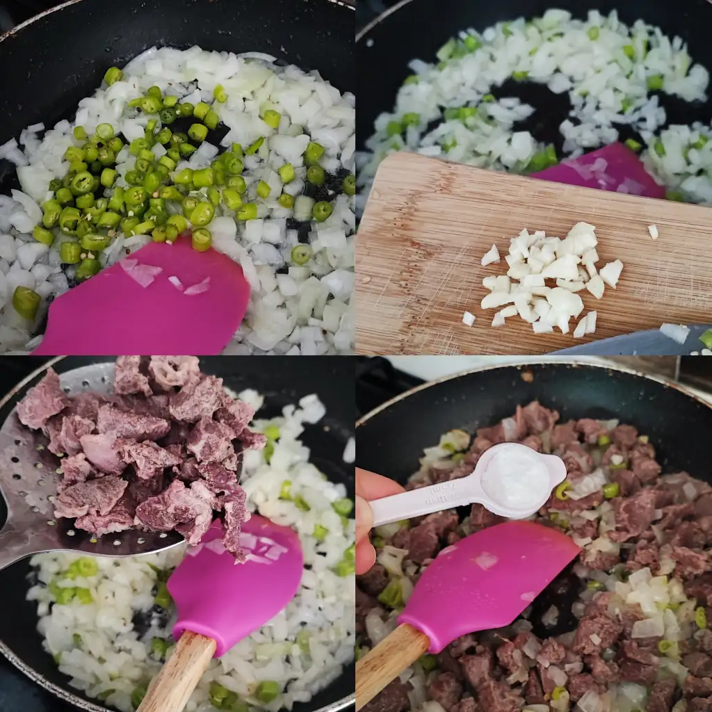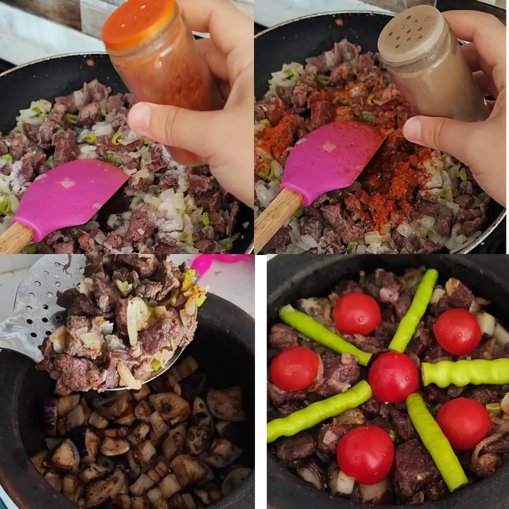 Bir tavada soğanları kavurup biberi sarımsağı ekleyip haşlanmış etleri ilave ederek baharatlayıp karıştırıyoruz.