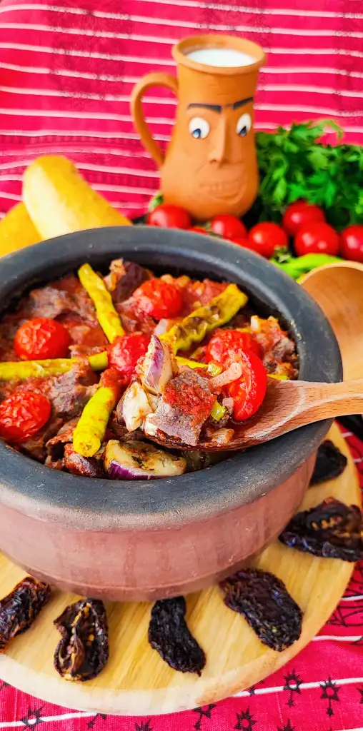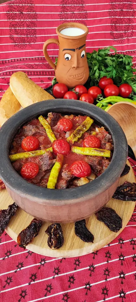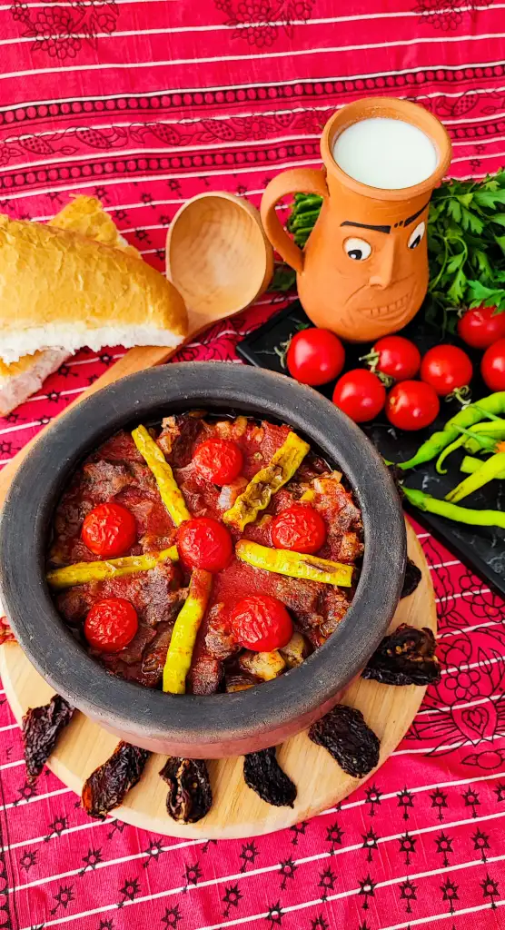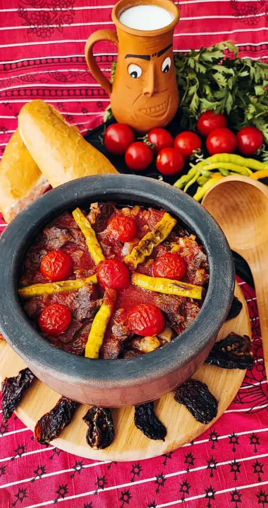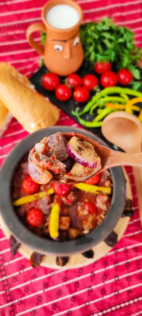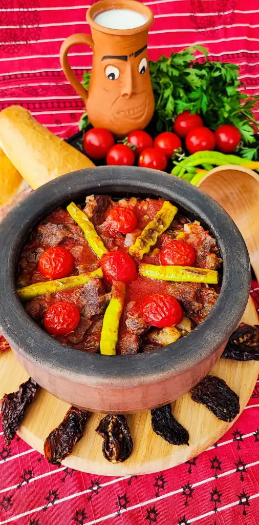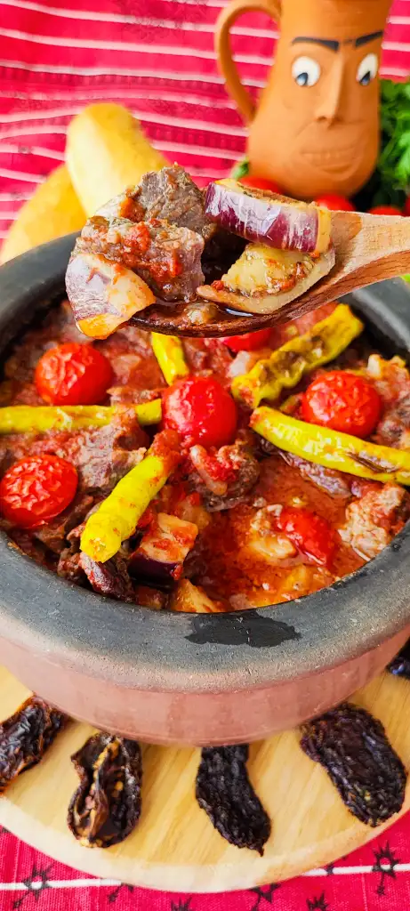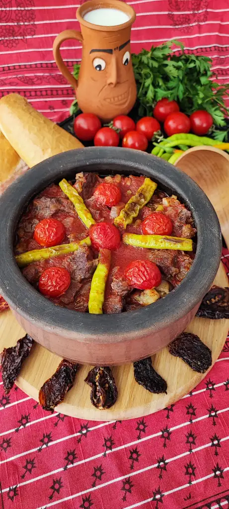 Şimdi malzemeleri birleştirme vakti. Uygun bir kaba(ben güveç kullandım borcam da olur) alta kızartılmış patlıcanları üzerine et sotemizi yayıyoruz. Ardından et suyumuza 2 kaşık salça ilave edip sosu kabımıza gezdiriyoruz. Son olarak üzerine domates biber ilave edip 200 derece fırında domates biberler kızarıncaya kadar pişiriyoruz.