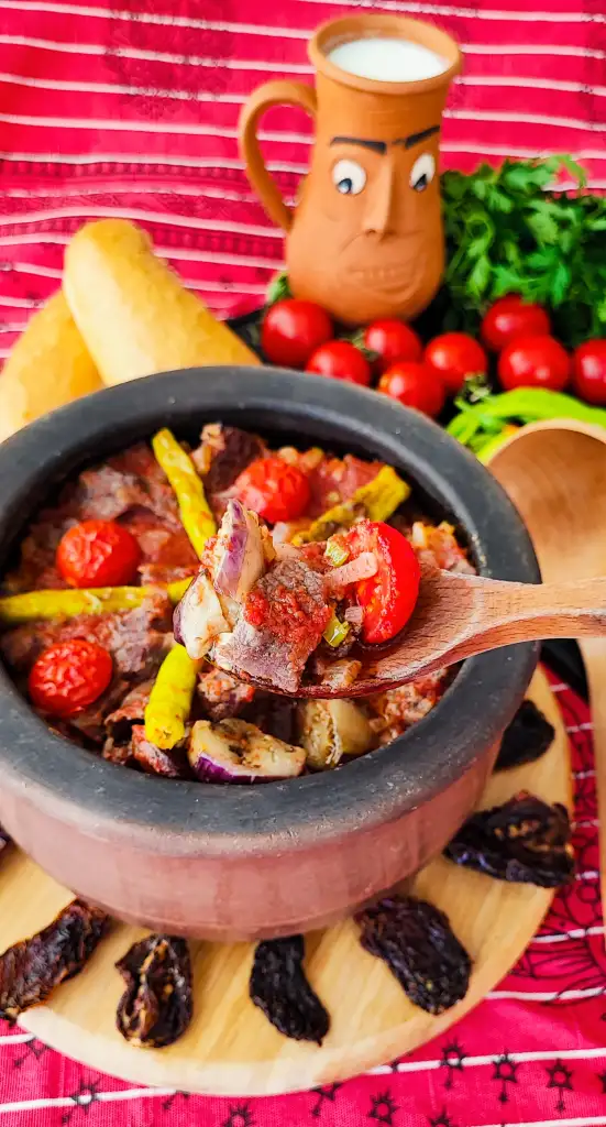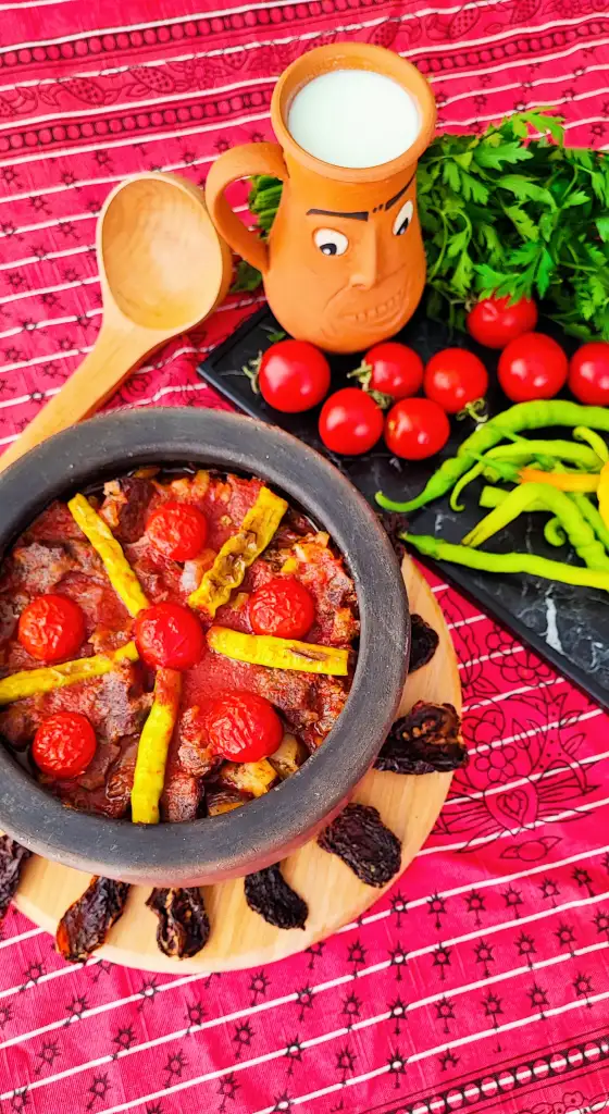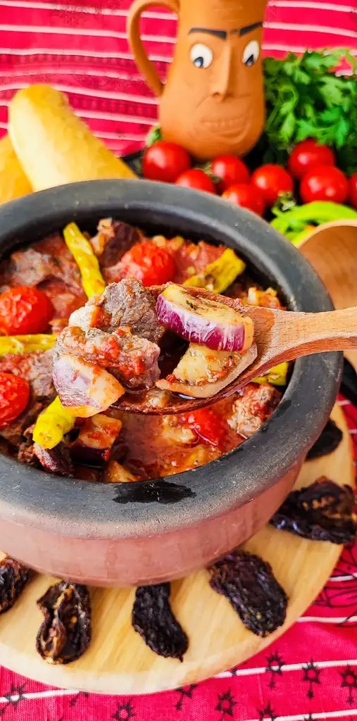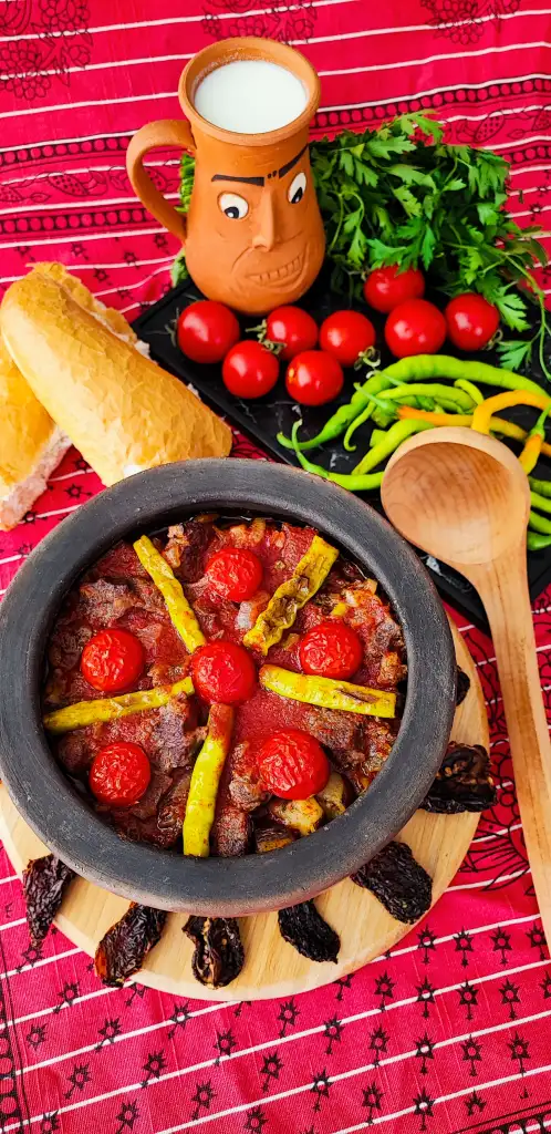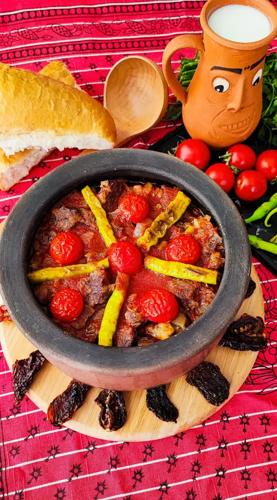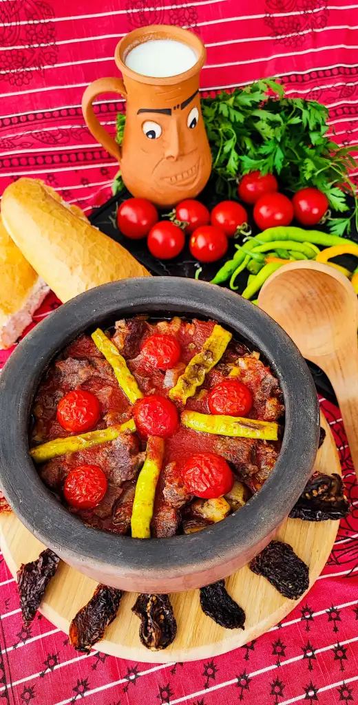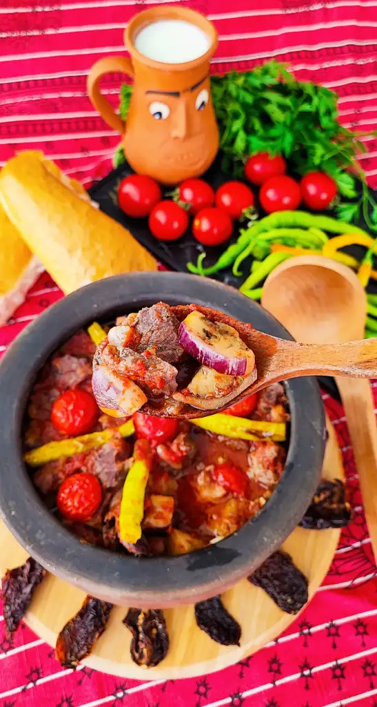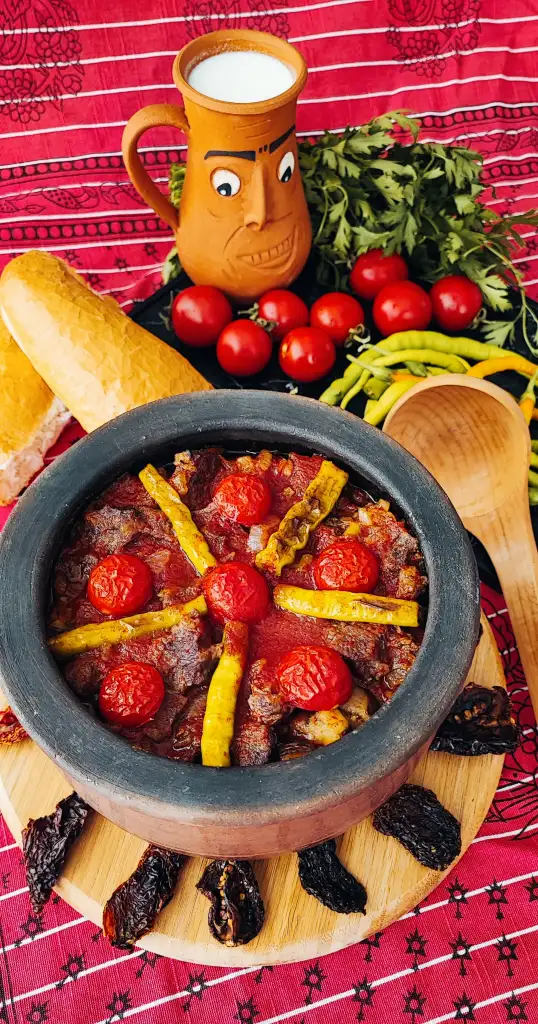 Şimdi malzemeleri birleştirme vakti. Uygun bir kaba(ben güveç kullandım borcam da olur) alta kızartılmış patlıcanları üzerine et sotemizi yayıyoruz. Ardından et suyumuza 2 kaşık salça ilave edip sosu kabımıza gezdiriyoruz. Son olarak üzerine domates biber ilave edip 200 derece fırında domates biberler kızarıncaya kadar pişiriyoruz.