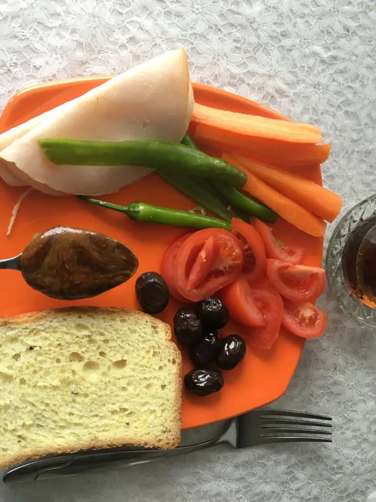 kahvaltı haşlanmış yumurta piliç füme zeytin domates biber maydanoz 1 dilim ekmek şekersiz çay