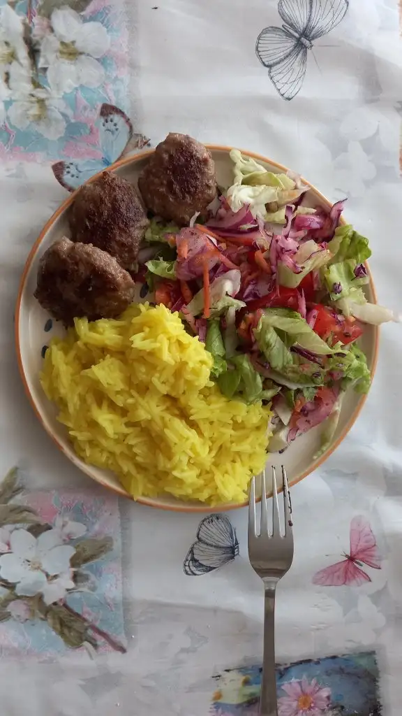 Aksam ev yapımı kofte yagsiz limonlu salata zerdecalli haşlama basmati