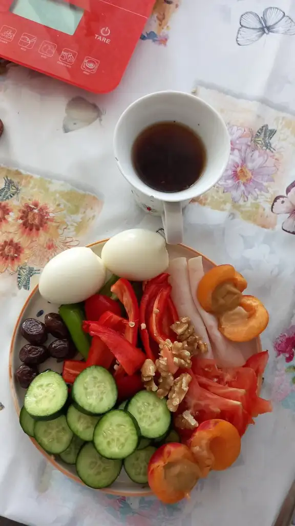 Kahvaltım kayisi fistik ezmesi domates salatalık biber 2 tane yumurta ve hindi fume zeytin