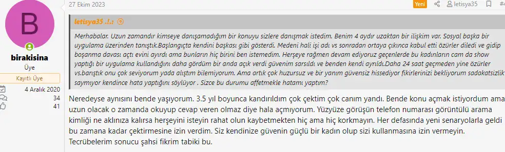 Neredeyse aynısını bende yaşıyorum. 3.5 yıl boyunca kandırıldım çok çektim çok canım yandı. Bende konu açmak istiyordum ama uzun olacak o zamanda okuyup cevap veren olmaz diye hala açmıyorum. Yüzyüze görüşün telefon numarası görüntülü arama kimliği ne aklınıza kalırsa herşeyini isteyin rahat olun kaybetmekten hiç ama hiç korkmayın. Her defasında yeni senaryolarla geldi bu zamana kadar çektirmesine izin verdim. Siz kendinize güvenin güçlü bir kadın olup sizi kullanmasına izin vermeyin. Tecrübelerim sonucu şahsi fikrim tabiki bu.