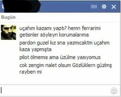 Hiç unutmam o zamanlar ergenim Facebook'ta biriyle tanıştım. Neyse zamanla ciddi ilişkimiz oldu asdfjkl ama öyle yüzyüze görüşmek yokneyse bi gün bi anda iletişim kesildi asla ulaşamıyorum. Üç ay sonra ulaştı bu bana ve şey dedi trafik kazası yaptım her yerim kırıldı bu zamana kadar komadaydım. Tabi tabi