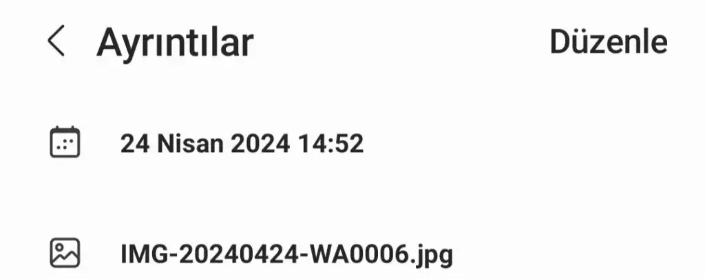 Evet böyle tarihli ama whatsapp konuşması yok, galeriden silmiş çöp kutusu kısmındaydı. O yüzden whatsapp tan gönderilen tarih ve saat vardı. Yani çekilen gün saati bilmiyorum. Fotoda gündüz ama tarihte akşam 22.40 ta atılmış. Çok merak ediyorum çekilen gün, yıl ne zamandı ben varken mi yokken mi. Ve kız buna bunca zaman sonra göndermiş yani bi whatsapp mesajlaşması olmuş. Kısa sürdü hemen sevgilim olduğunu söyledim konuşmayı kestim diyor ama güvenemem.Whatsapptan gönderilen resimlere şimdi baktım teyit etmek için. Ayrıntılara tıkladığımda gönderim tarihi ve dakikası yazıyor zaten. Altında da resmin ismi var isminin içinde tarih gizli zaten. Şu şekilde göstereyim: