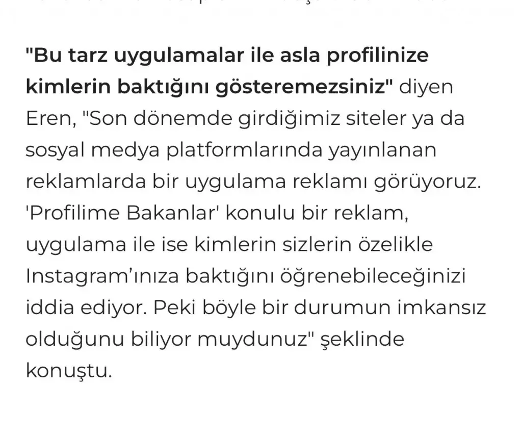 Bu tür programlar genelde sizin en çok baktığınız hesapları gösterir size bakanları değil, denemek için başkasının hesabından kendi hesabınıza girin bakın onu da gösterecek mi? Uzman görüşünü de ekliyorum. Hatta uygulamada telefonunuza bir çok erişim izni verdiğiniz için de her şeyinize program aracılığıyla ulaşılıyorlar. Eki Görüntüle 3032428