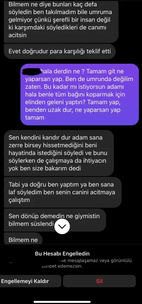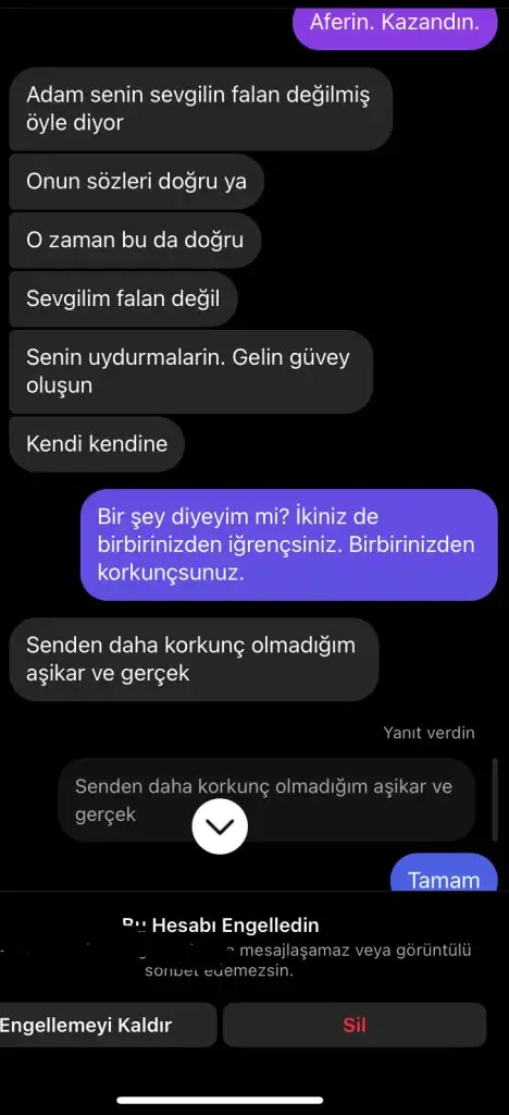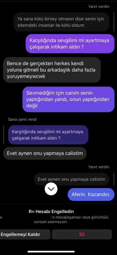 Arada adam sözde mesaj atmış. Bu yer kaplamasın diye aradaki mesajları silmiş. Aynı gün içinde 3 defa hadi konuş, neden konuşmadın hala onla diye mesaj atmış. Adam cevap vermemiş. Bana bunları gösteriyor. Ve adamdan ayrıl bak seni üzer diye bana söylüyor sözde.