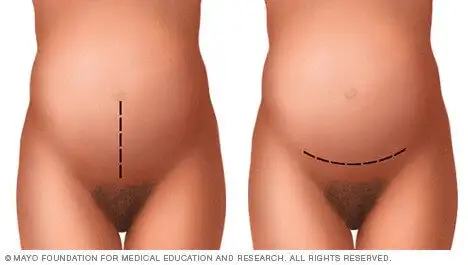 Sezaryen, alt karın ve rahim kesilerini içermektedir.ilk başta alt karın kesisi yapılır. Bu kesi, göbekten başlayarak kasık kıllarına kadar dikey bir şekilde (solda) ya da daha yaygın olarak karnın alt kısmında yatay bir şekilde yapılmaktadır (sağda).