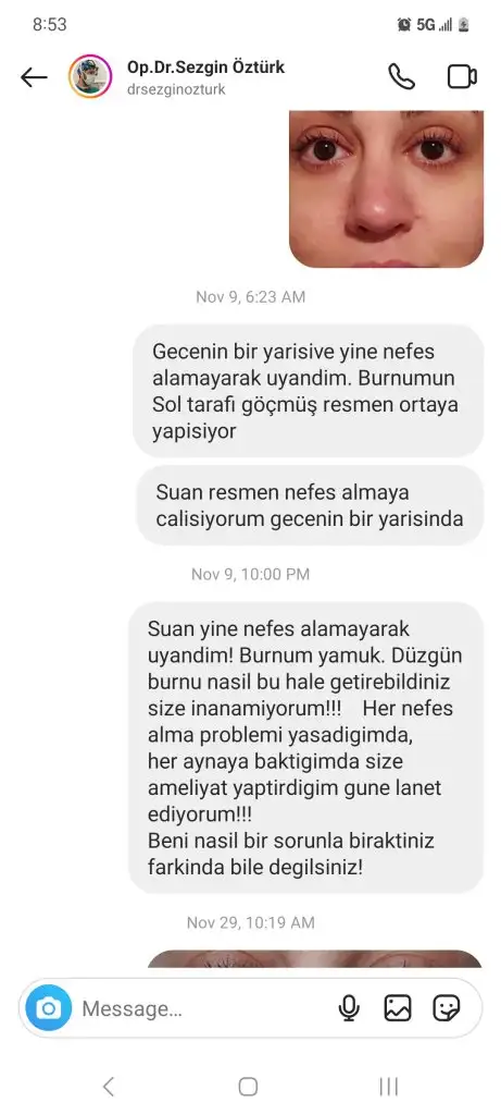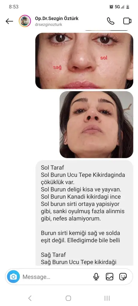 Merhaba , bende Sezgin beye ameliyat olanlardanım burun sağ tarafı çöktü ama kendisine göre mükemmel çökük yere dolgu yapalım revizyon çok zor ve çoook pahalı dedi bende zaten kendisine revizyon yaptırıp gene bir sürü para verip sonunda berbat bir burunla karsılaşacagımı bildiğim için istemedim istesemde ücretsiz yapmayacağıı kesindi hayatımın hatasını yaptım o doktoru seçerekDoktor Sezgin Ozturk kadar rezil,sahtekar doktor gormedim!! Instagramdan yaziyordum ona surekli, cunku burnumu mahvetti, Beni instagramdan engellemis! Googledan yorum yapmaya calistim, yorumlarimi silmis ve hemen kendi cevresine 5 star sahte yorumlar yaptirmis. Arkadaslar bu adama dair gordugunuz hersey duzenbazlik, goz boyamak. Size ekran goruntulerine kadar paylascam. Adam vergi de kaciriyor zaten.