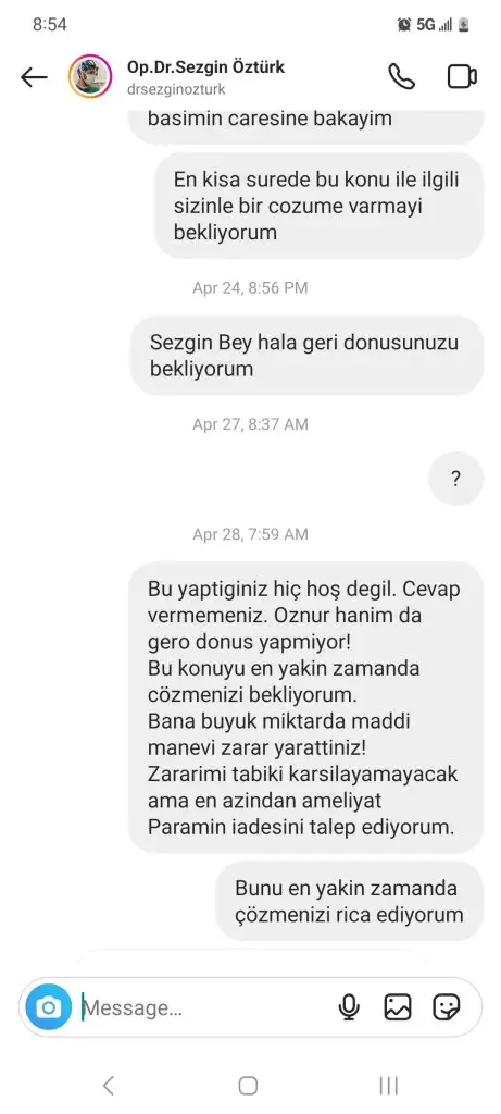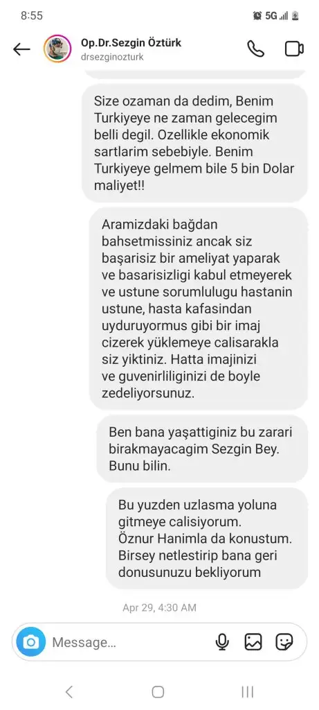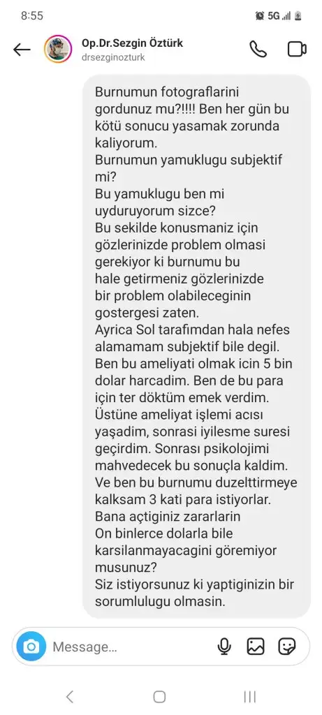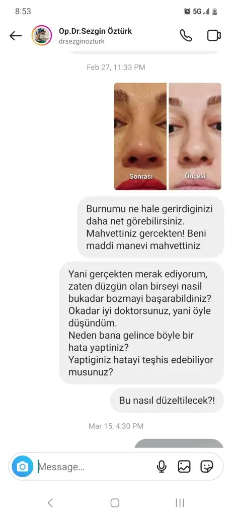 Bu konuda size birkaç kez daha yazmıştım.Sütten ağzım yandığı için bir kez daha yazmak istedim.Bu doktor sürecinizi daha kötüye götürmekten başka bir işe yaramaz.Hatasını telafi yerine zor olsada ücretinizin geri ödenmesini isteyebilirsiniz.Doktor Sezgin Ozturk kadar rezil,sahtekar doktor gormedim!! Instagramdan yaziyordum ona surekli, cunku burnumu mahvetti, Beni instagramdan engellemis! Googledan yorum yapmaya calistim, yorumlarimi silmis ve hemen kendi cevresine 5 star sahte yorumlar yaptirmis. Arkadaslar bu adama dair gordugunuz hersey duzenbazlik, goz boyamak. Size ekran goruntulerine kadar paylascam. Adam vergi de kaciriyor zaten.