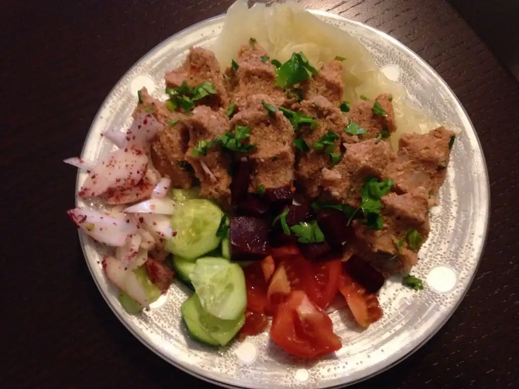yanında garnitür olarak domates, salatalık, pancar turşusu, haşlanmış lahana, sumaklı soğan