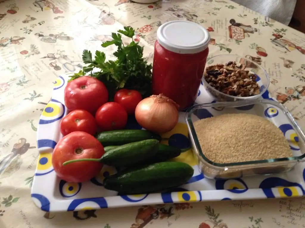 ilk olarak soğanı yemeklik olarak doğrayıp maydanozla birlikte 4 çay bardağı düğürcüğün içine koyuyoruz daha sonra robotta çektiğimiz domatesleri azar azar ekleyerek yoğurmaya başlıyoruz düğürcükler yumuşamaya başlayınca robotta çekilmiş cevizi ekleyerek yoğurmaya devam ediyoruz tadına bakıldığı zaman çıtırtı olmayacak şekilde yoğuruyoruz yumuşatmak için ara ara çekilmiş domatesten ekliyoruz iyice yoğurulduktan sonra bir kısmını sıkma olarak ayırıyoruz. Kalan kısmına soğuk su ilave ederek sulandırıyoruz çok sıcaklarda bu aşamada buz da koyabiliriz tuzu ilave edildikten sonra garnitürlerle servis yapıyoruz