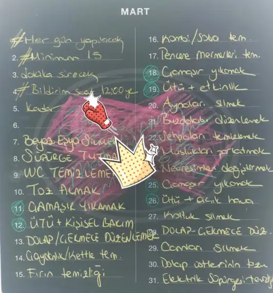 Listeyi yaptim iste kagida. Onun resmini koydum. Soz de evinize asin. Bugun kimse wc temizlemedi mi