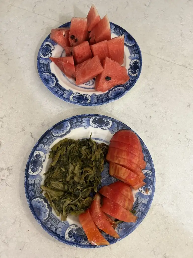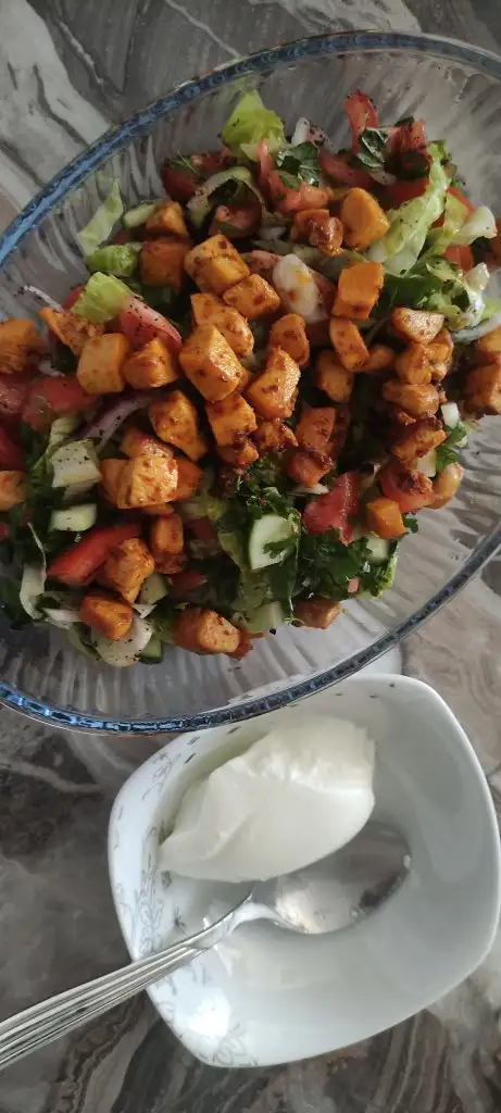 Akşam bir tabak patlıcan ezmesi ve birazcık et, birer adet domates ve salatalık yedim.