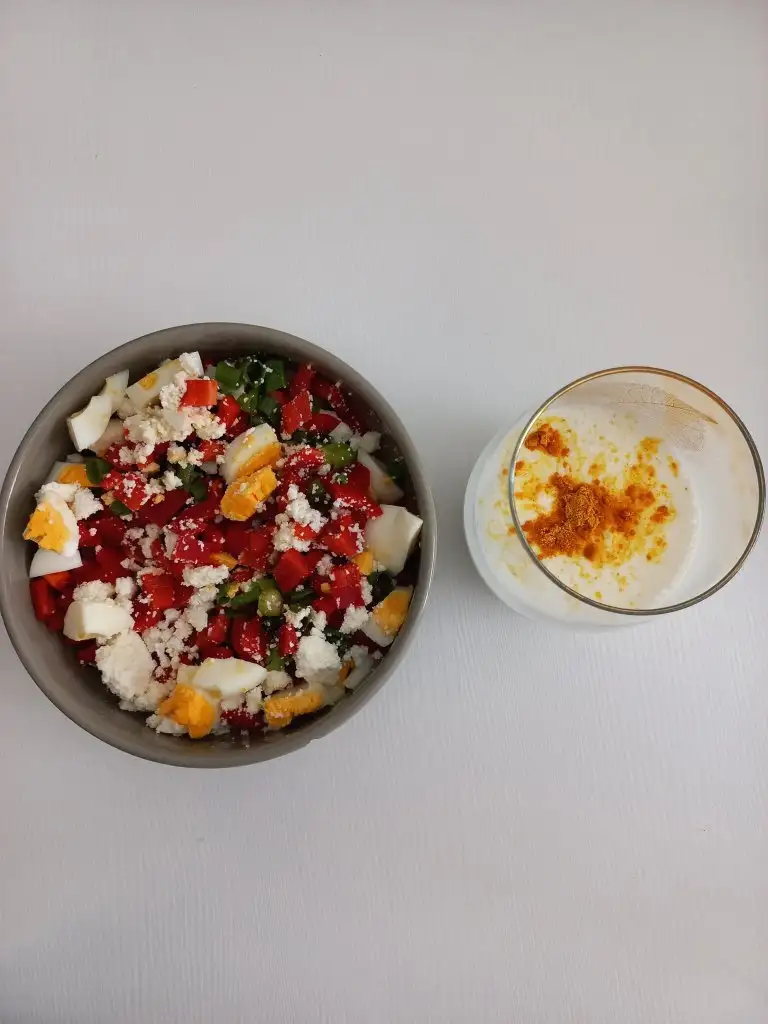 Salataya da yeşil soğan, kapya biber, 1 yumurta, 2 kaşık lor peyniri, zeytinyağı, limon ve sumak koydum. Yanında 1 dilim çavdar ekmeği yiyeceğim