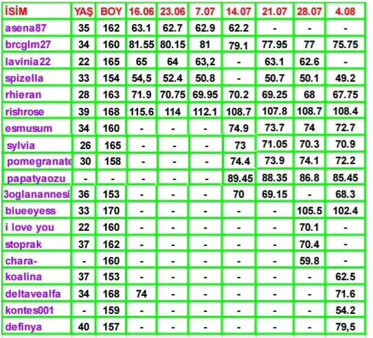 Yaaa ben gidemem hem bebeğim küçük hemde ben yaşam tarzı değişikliği olarak bakıyorum duruma eğer diyet kafasına girersem ve kaçamak yaparsam nasılsa bozuldu diyorum ipin ucu kaçıyor :)Ben de mi tartıdan bakıyorum metabolizma yaşım gençleştiyağ oranım düştü gerçektir inş ama diyetisyene gitmek istiyorum hem takip hem yağ oranı cihazı için