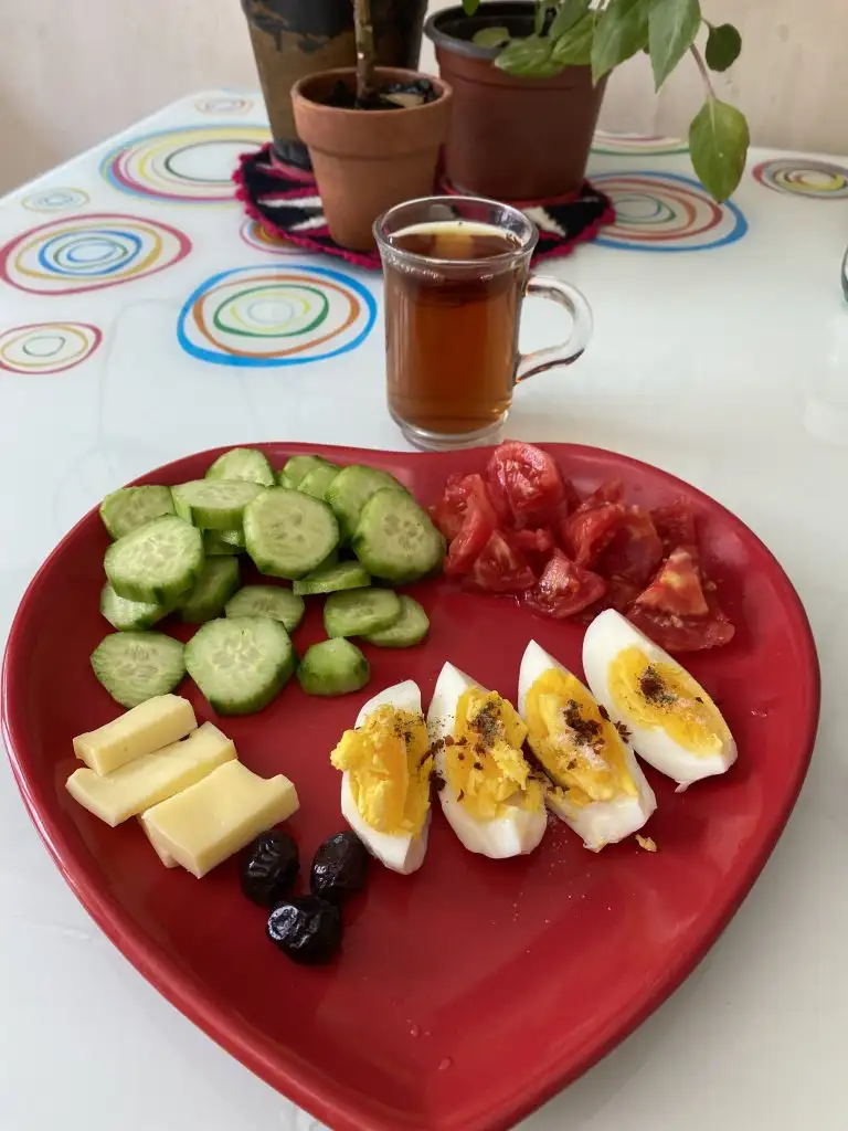 Sabah 1 haşlanmış yumurta 2 kozlenmis biber 1 dilim tb ekmeği peynir zeytin domates salatalık