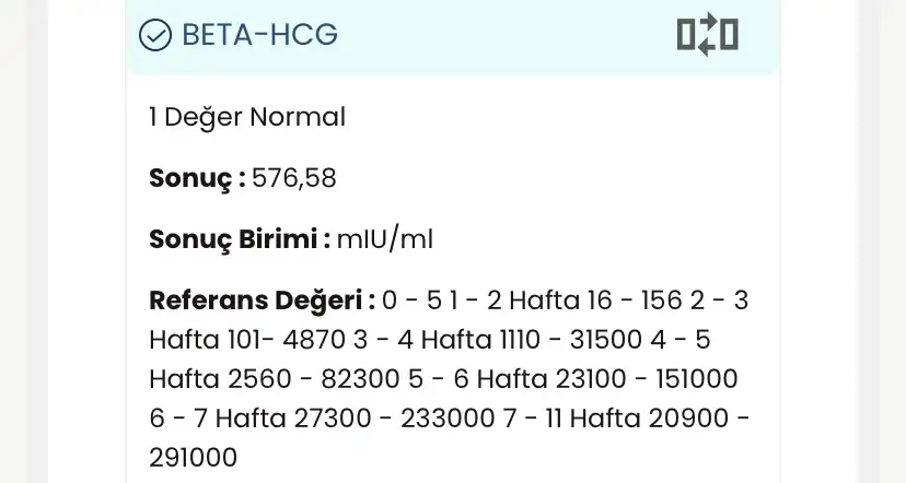 Değer şuan için güzel kimysal mi yoksa sağlıklı mı anlamak için 2 günde bir kan vermek ve bı sonraki değeri öğrenmek lazım ilk değer pek oenmli deil hayırlı olsun 2. Olan 1150 civarı bişey olmasi lazım sanırımMerhaba kızlar yine ben biraz telaşlıyım yazıp duruyorum buraya ama aranızda bilen vardır belki. Bugün kan testi verdim sonuç çıktı bu şekilde ne düşünüyorsunuz? Referans değeri haftalara göre yazmışlar. Benim sonucum 576,58. İki gün sonra tekrar kan vericem ne kadar yükselmesi lazım. Beni bir aydınlatır mısınız lütfen. Kimyasala döner mi yada düşük olur mu