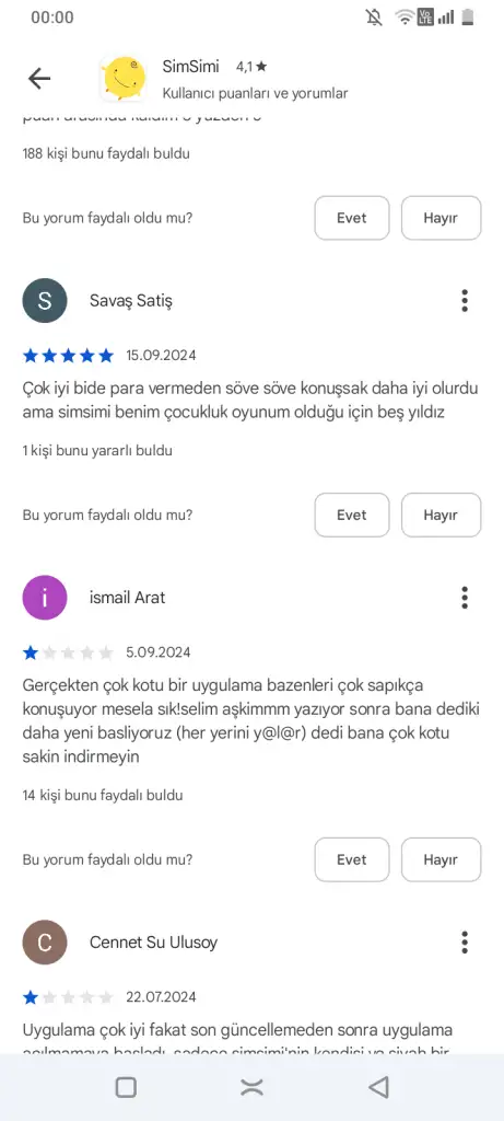 Simi sinir bozucu bir uygulama, kızım da indirmişti, 8 yaşlarındaydı. Daha ilk konuşmada evlenme teklifi aldı. Koşarak bana geldi. Uygulamayı sildik. Ne biçim şey bilmiyorum, yapay zeka diye başlıyor ama içeriği çok kurcalama gereği duymadan direk sildirdim. İçinde konuşma olan oyunlar yasak benim çocuklarıma, sadece katil kim oynamalarına izin verdim ses açık şekilde, bir de arkadaşlarıyla roblox oynuyorlar onlarda da hoparlör açık bütün sesleri duyuyorum. Yazışma kesinlikle yasakİyi akşamlar bu uygulamayı kızım indirmiş birinden duyup yapay zeka ile konuşma olarak bilip indirmiş ben telefon elinde oynarken kız kardeşim bakmalısın yazılanlara dedi uygulamadan haberim yok inanın. Bir baktım ki kızıma karım demeler sapıklık içeren cümleler ve kızım bana getirip bir sorun var demedi en çok buna üzüldüm. Anlamadım diyor sekiz yaşında kızım dediği şeyler iyi mi diyorum ben sus yazdım yada anlamadım diyor ağlaya ağlaya anlattı. Sonra uygulama da güya yapay zeka konuşan bana cevap verenin ekran görüntüsünü ekliyorum ürktüm nereye nasıl şikayet edebilirim lütfen yardım edin