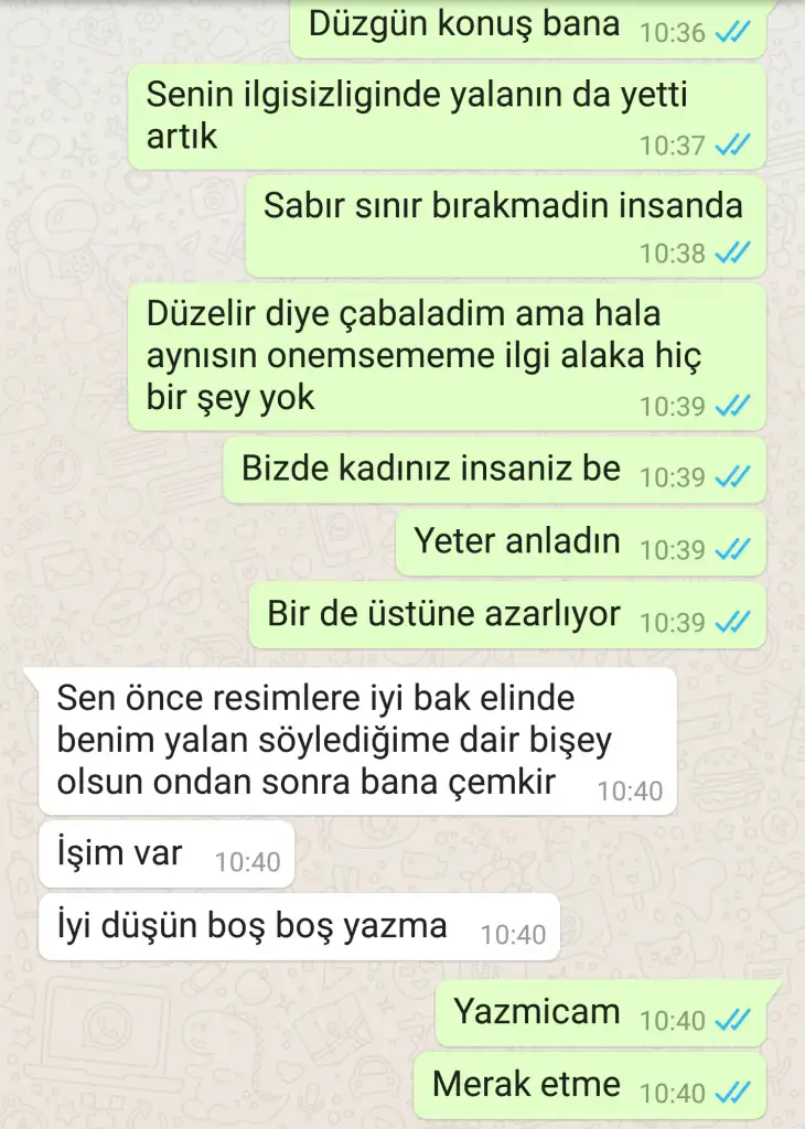 son durum en son dün saat 10 da aradı beni sordum olayı tabiki yalanladı bak dedi benim anahtarımla resimdeki anahtar aynı mı dedi salak salak yorum yapma dedi daha sonra gevezelik yapma boş boş yazma bana çemkirme dedi ve dünden beri ne arama ne sorma var ve sürekli çevrimiçi