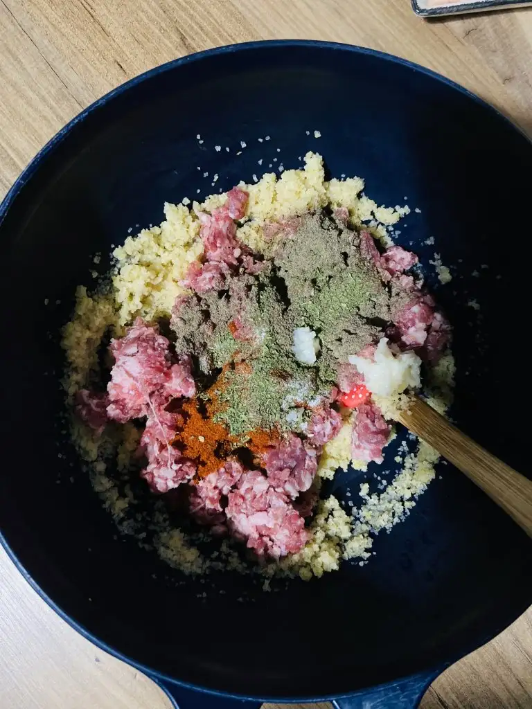 Bulgurlar şiştikten sonra karıştırın sonrasında kıymayı tuzu baharatları ve sarımsağı ekleyin