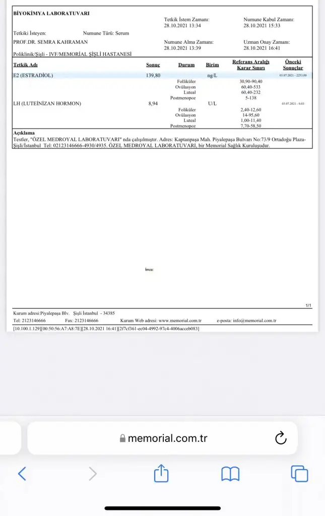 Kızlar bugün tekrar gittim memorial’e. Yumurta 14 mm olmuş. Hormon testi istendi. Sonucu ekliyorum. Sanırım çok düşük çıkmış. Bugün adetin 15.günü 🥺