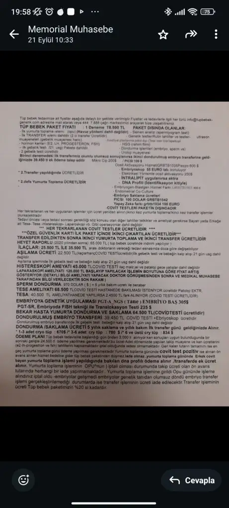 Güncel fiyatlar bu 21.09.2024 te aldım bu fiyatıHerkese merhaba ve bol sanslarben cok eskide kaldim. Dondurulmus embriyo transferi fiyatini bilen var mi? Benim iki tane embriyom kaldi memorialde, cok aradayim ikinci hamilelik icin.