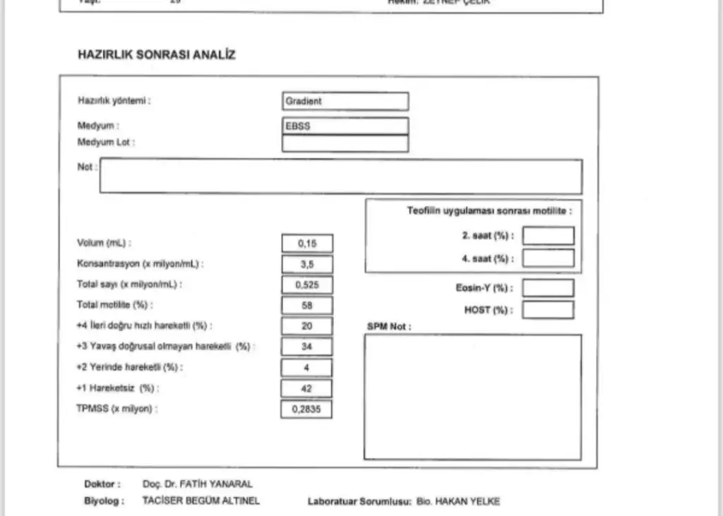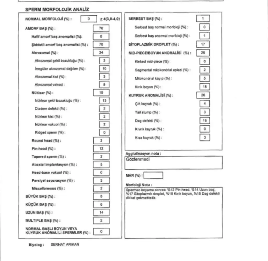 Eşimin sperm testi bu şekilde tedaviye başladık bakalım daha yumurta toplama bölümüne gelmedik doktor olumlu konuştu fakat sizce olumsuz olma durumu varmı acaba bir daha test verecek zaten iğnelerden sonra