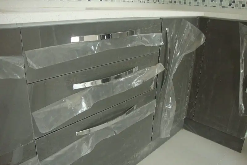 yeni aldığım evimin mutfak dolapları siyah beyaz tezgah arkası gri beyaz siyah küçük karelerden oluşuyo kapılar beyaz