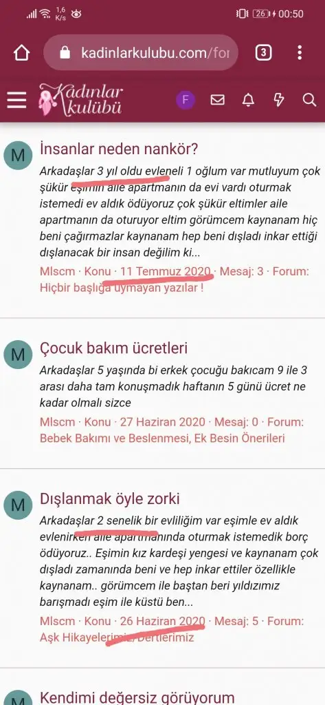 Bende farkettim sürekli aynı konular konu sahibi bence çok fazla takıntı yapmış. Sürekli aynı aramıyorlar sormuyorlar vs yani bazen herkese bağırasım geliyor görümce elti sizle yüz göz olmak aramak zorun değilHanımefendi etiket vs değil ki derdim, ben de yeni üyeyim ben de çoğu şeyi bilmiyorum. Anlamadığım şey şu yazdıklarınıza göre; 10 haziranda 4, 11 haziranda 3 buçuk, 24 haziranda 5, 26 haziranda 2 senelik evlisiniz. Hanımefendi siz kaç senelik evlisiniz neden hep değişiyor![]()