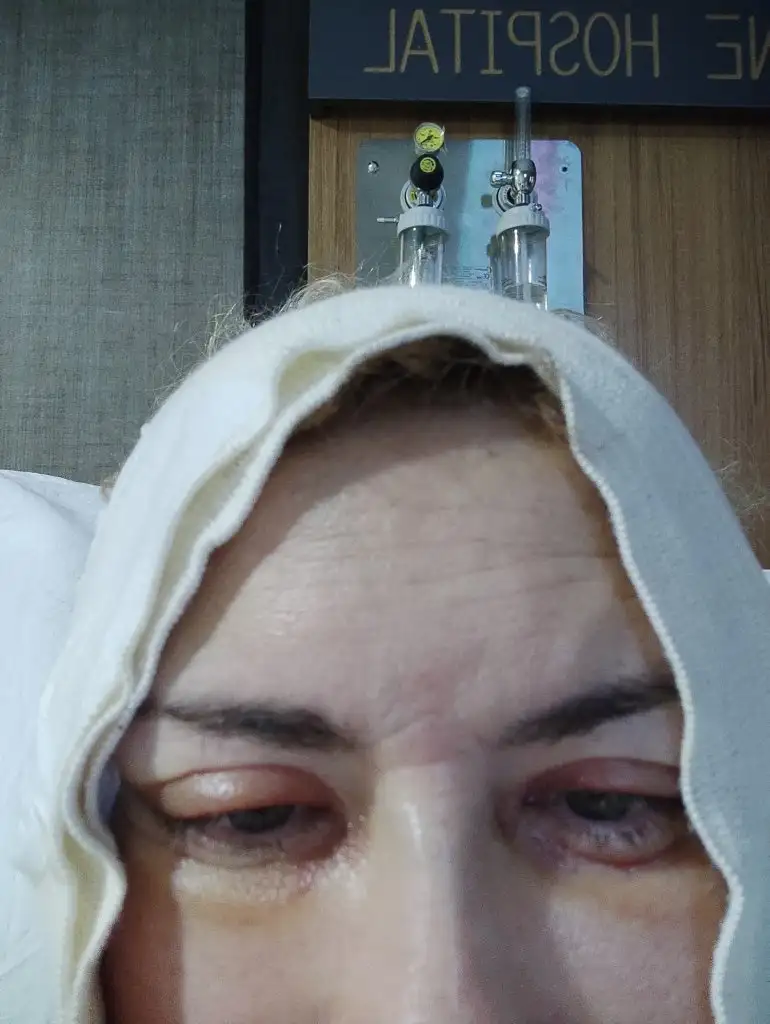 Bu da ameliyat sonrası ilk resim, gördüğünüz gibi yüüm ve kafam çok şiş ve gergin, boyunda öyleydi, gayet sıkı ve genç bir görünüm olmuştu. Serdar hoca, bana göz ve kaş germe/kaldırmada uygulamıştı fakat eşim ifadem değiştiği için biraz kıskandı, ertesi gün lokal anestezi ile 2. bir küçük operasyonum oldu, kaşımı ve gözümü eski haline getirdi. İkinci resimde de onu paylaşacağım
