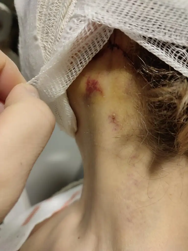Ameliyatta boynumun sağ ve sol tarafından yaklaşık 4cm deri fazlası çıkarıldı, toplamda 8 cm. Kulak hizasından arkasına, saç diplerine kadar kesi yapıldı ve smas işlemi yapıldı, arkadaşlar, deri gerilmedi, çıkarıldı ve altta ki smas tabakası gerilip tamir edildi, bu klasik işleme göre daha net sonuç veriyor ve çok uzun sürüyor, ömürlük desem yeridir. Ama ağrılı hele ki ben, ertesi gün revizyon istedim, aslında çok güzeldi ama eşim rahat bırakmadı, sürekli kaşın gözün eski halinde olsun dedi o yüzden hoca lokal anestezi ile eski haline getirdi. Onları indirince şöyle durdu ama unutmayın, yüzüm ve kafam çok şiş