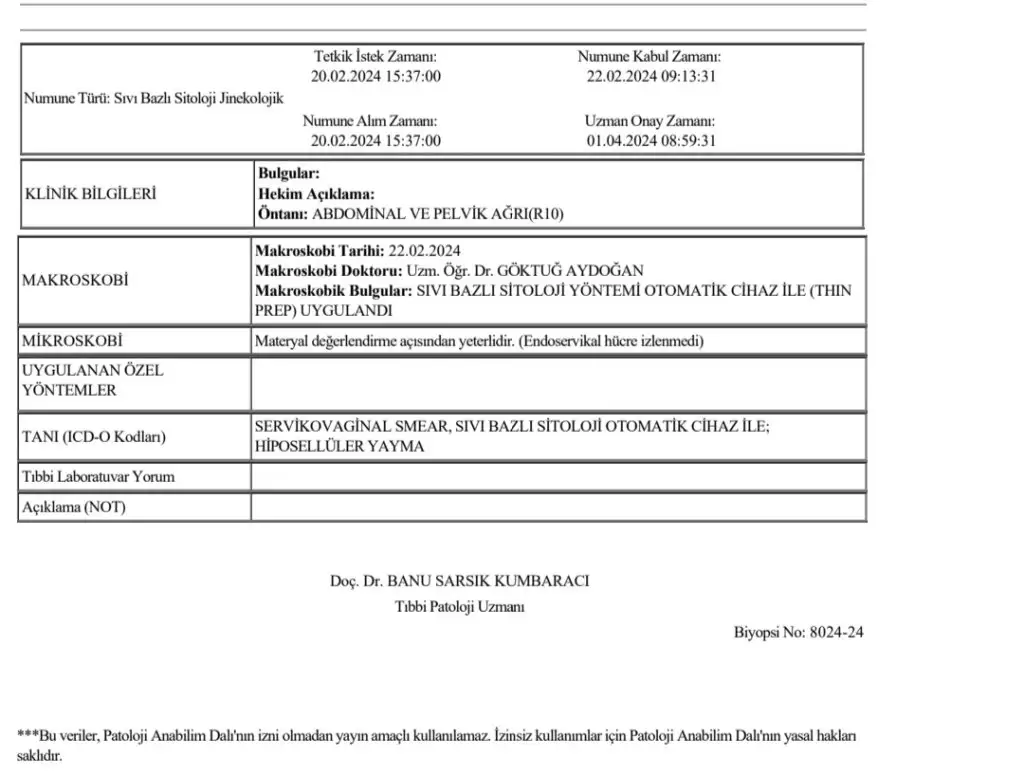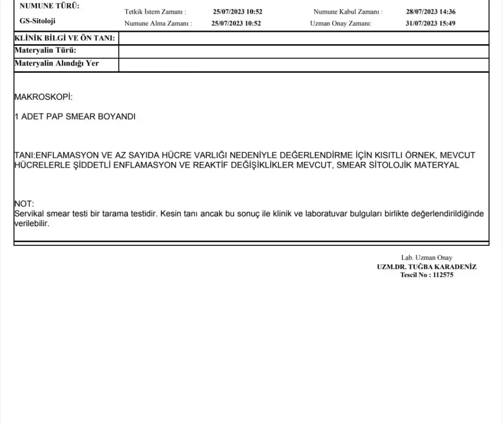hayır. zaten raporda alınan numunenin yeterli olduğu yazıyor. sadece sonucun nerede yazdığını göremedim, onla ilgili bir ifade yok. çıkmamış olma ihtimali var mı henüz sonucun?