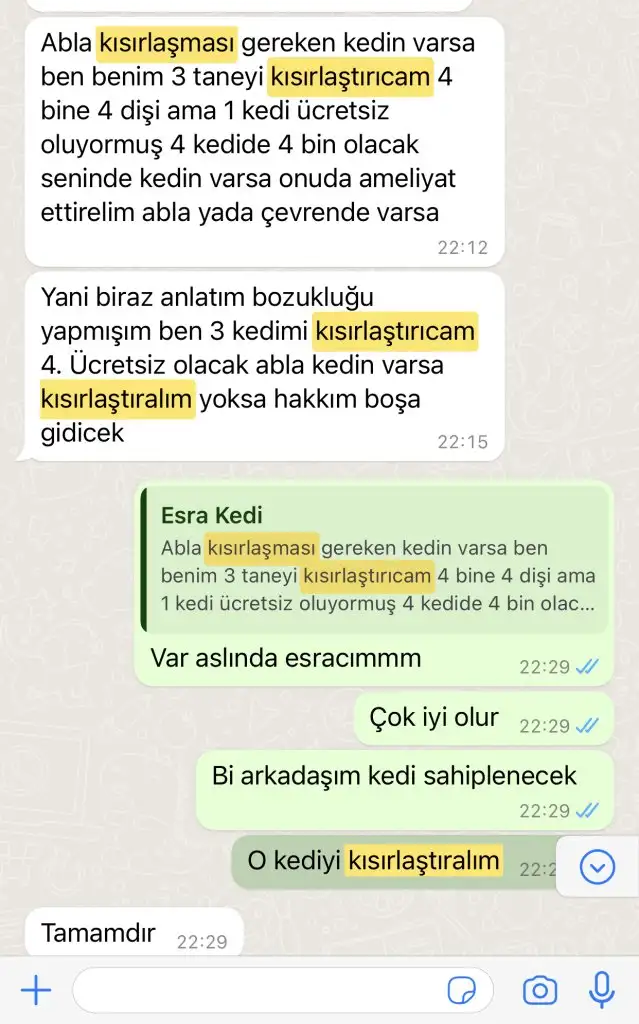 Kısırlaştırma yaptım defalarca bu sorun için diyorum konuyu değiştirme yok uçurum yok hamileydim filan sen ne yaptın mesela hiç hayvan kısırlaştırdın mı ? Ve kısa vadede senin çözüm önerin ne kısırlaştırma senin için çözüm değilse ? Aklındakini açık açık söyleyecek cesaretin yok mu ? Söylemeye utandığın vahşi fikirlerini neden ima yoluyla belirtmeye çalışıyorsun sonra lafı çeviriyorsun ? Kısırlaştırma çözüm değilse ne mesela ? ben sırf bu ay 17 bin tl göndermişim derneklere kısırlaştırma ve besleme için sen yaptın ?