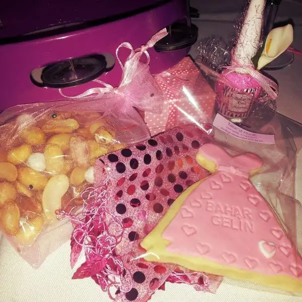 Kına hediyelikleri ise; gelinlik şeklinde olan kabarık etekli bir elbise gibi kurabiye yapılmıştı. Üzerinde isimleri yazıyordu. Yine konsepte uygun pembe oje hediyesi vardı. Pembe halay mendilleri vardı. Pembe kutu üzerinde beyaz puantiyeleri olan kutunun içine kınalarını koymuştu. Pembe tefleri vardı. Pembe kesenin içinde de kuruyemişleri vardı. Kınasında dansöz çıktı sahneye. Aklıma gelenler bunlar kuzum. Bide kına gece 3 kadar sürdü