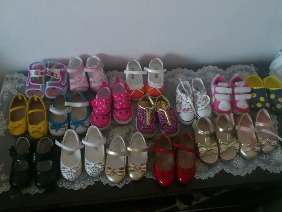 21-22 uyumlular. ikisi 20 tl olur.mor yanındaki pembe ve öndeki beyaz ayakkabı kaç numara ve ne kadar tutuyor