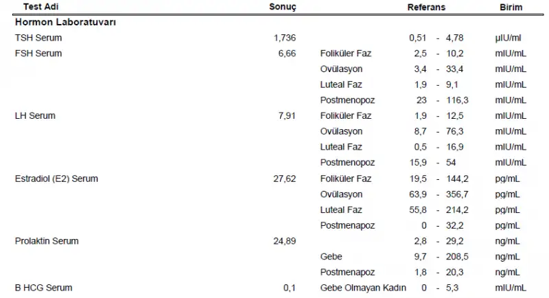 kadın doğuma gitmiştim geçen ay doktor ultrasonla ilk baktığında çok sayısa kist olduğunu söyledi daha sonra hormon sonuçlarıma baktığında kistin yok dedi sonuçta da pek bir şey yazmıyor ama anladığım kadarıyla bir şey yok ama güvenemedim yarın tekrar gidicem ama özellikle hormon değerlerime bakar mısınız?çenemdeki geçmeyen sivilceler için hormon testi istemiştim ama testesterona değeri yok sonuçta bu hormon testi eksik olmuş sanki yarın gidicem doktora neler söylemeliyim çünkü biz istemedikçe işaretlemiyorlar şuna da bakılsın diye..