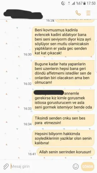 Sonra sana bi foto yolladım baksana dedim hali hazırda hala telefondayken, o kızla konuşmalarını fotoğraflarını yolladım..2-3 dakika boyunca sessiz kaldı ve sonrasında söylediği şey;