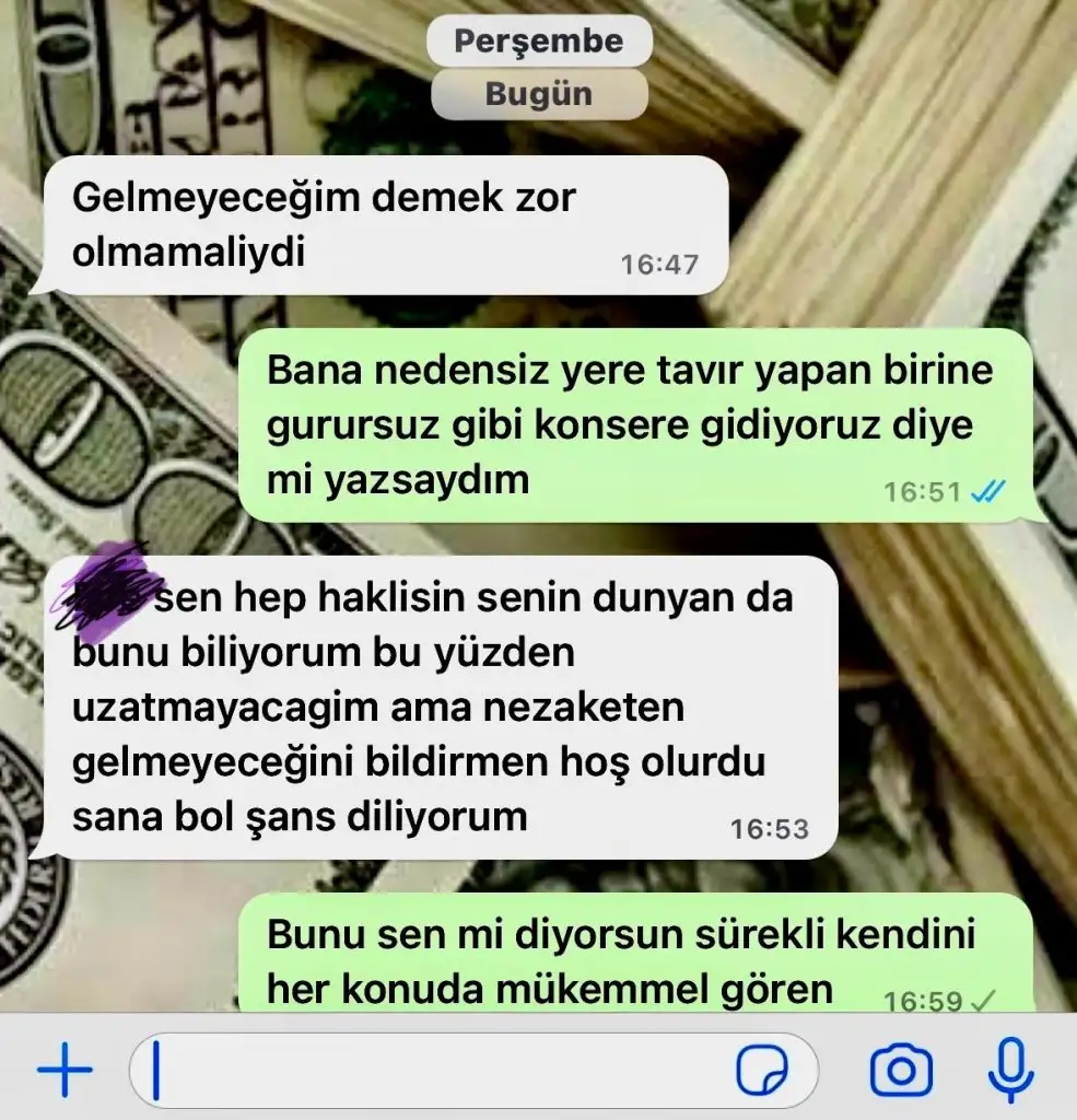 Yine de merakıma yeniliyorum konsere gideceğin arkadaşın ne yazdı da sana arkadaşlığınız bitti.