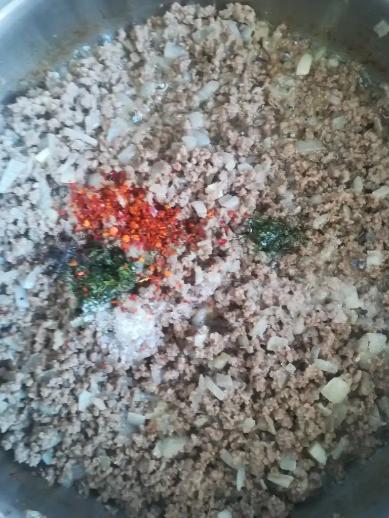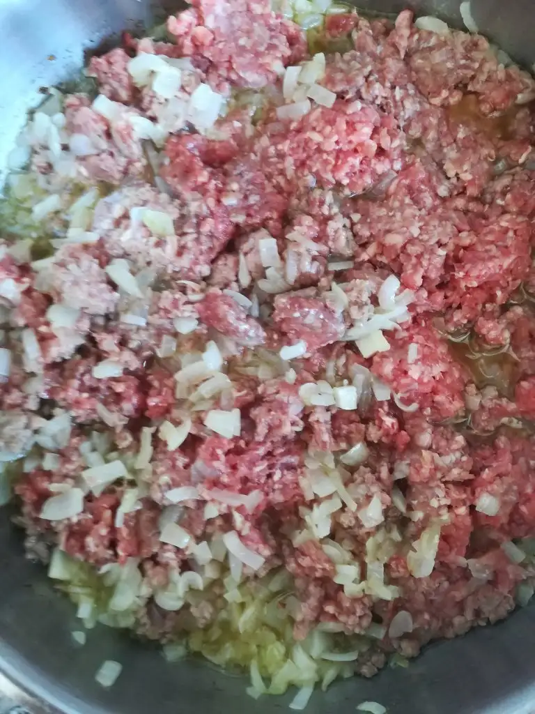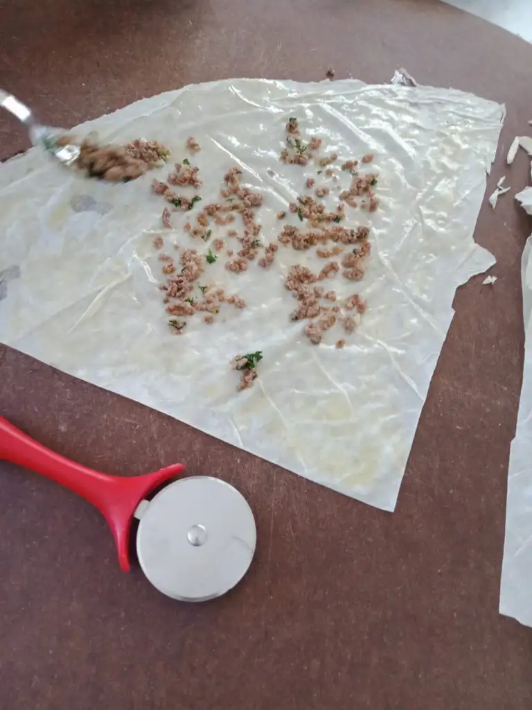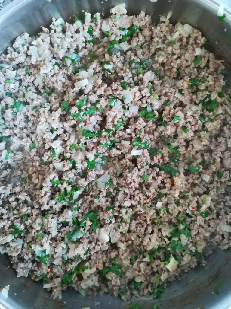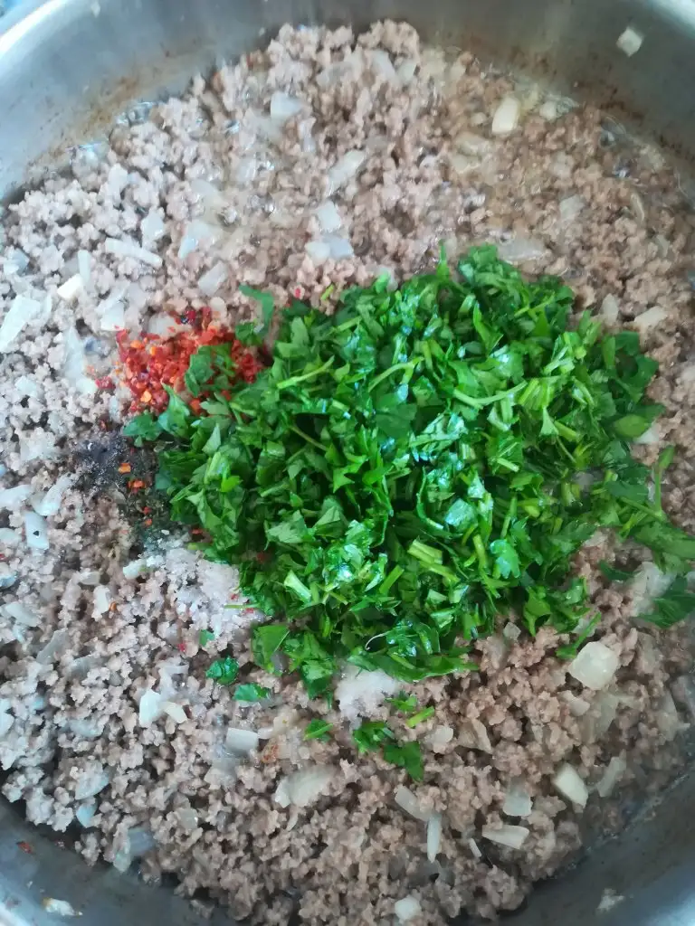 Öncelikle kıymalı harcı hazırlayıp soğumaya bırakıyoruz(kıymayla soğanı yağda kavuruyoruz, tuzunu biberini ekleyip biraz daha kavurup altını kapatıyoruz, ince kıyılmış maydanozu ekleyip karıştırıyoruz.