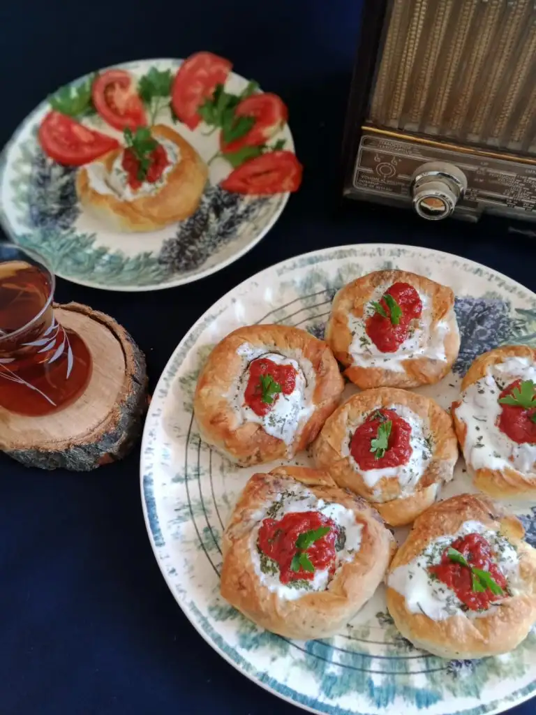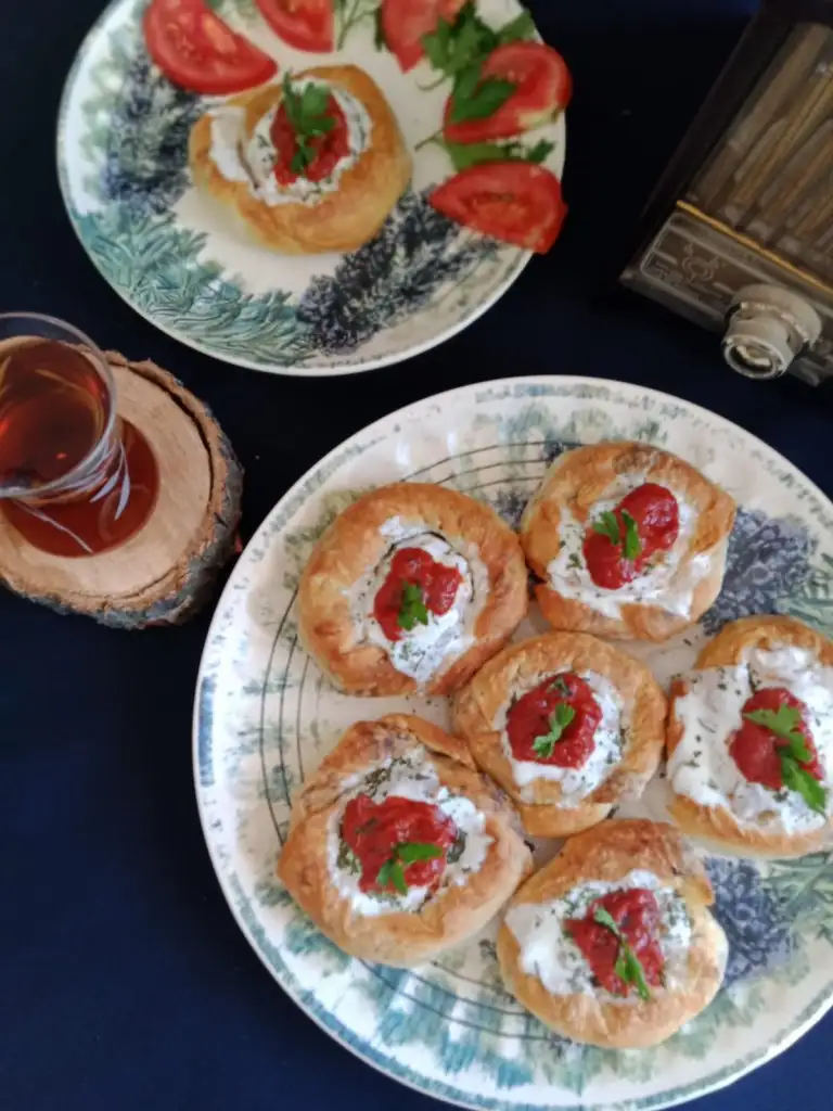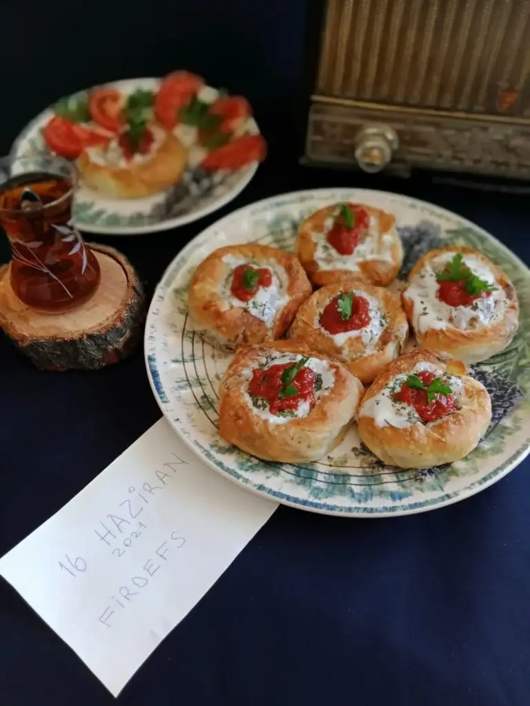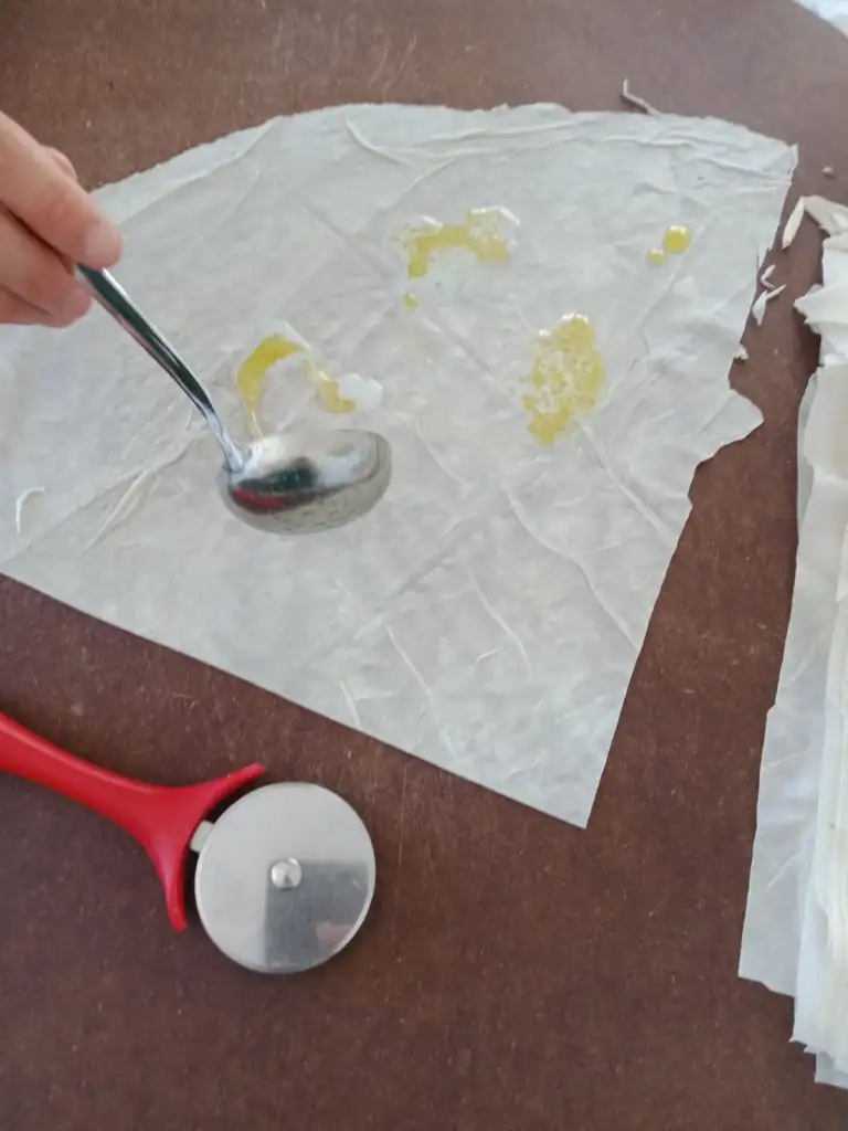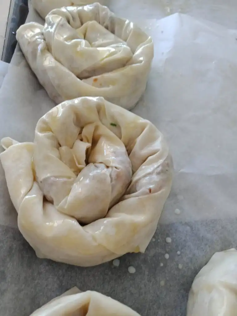 Bütün yufkaları bu şekilde yaptıktan sonra yağlı kağıt serilmiş fırın tepsisine yerleştiriyoruz, üzerine kalan sostan sürüp 180 derecelik fırında üzeri pembeleşene kadar pişiriyoruz( yaklaşık 25 dakika)