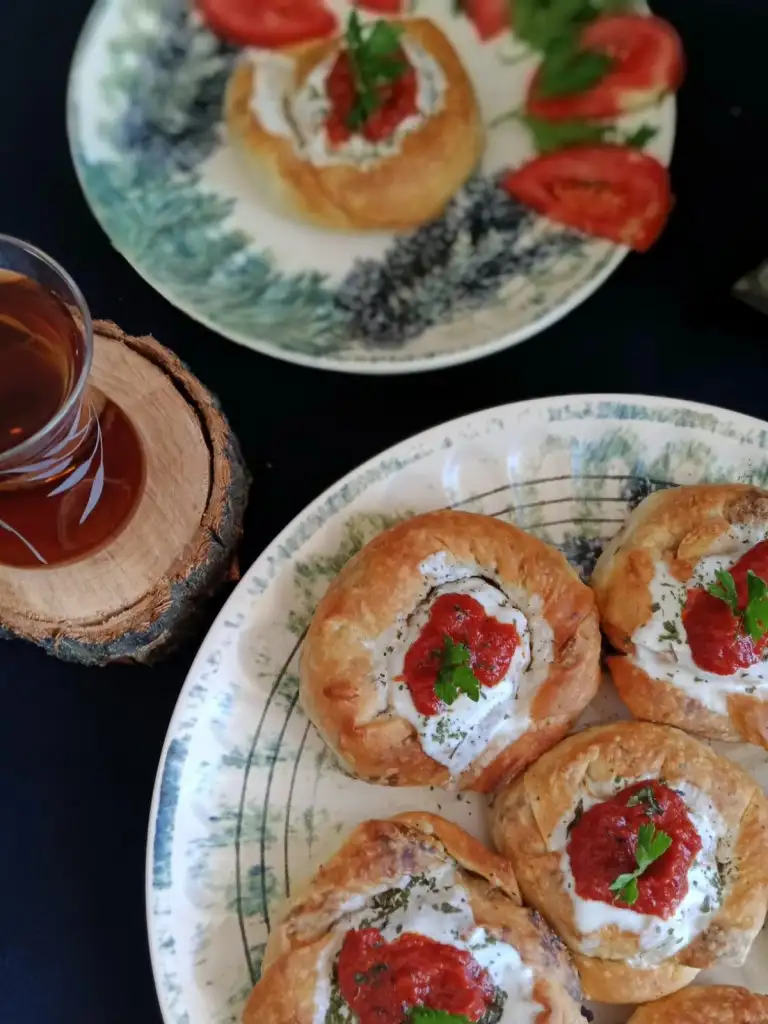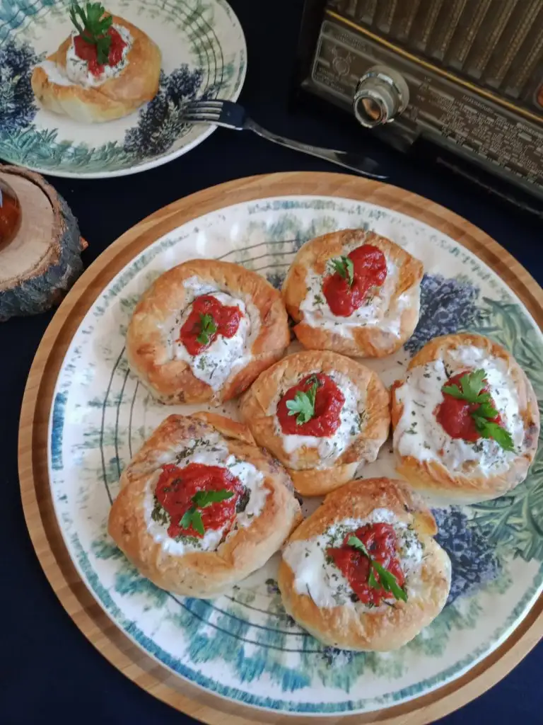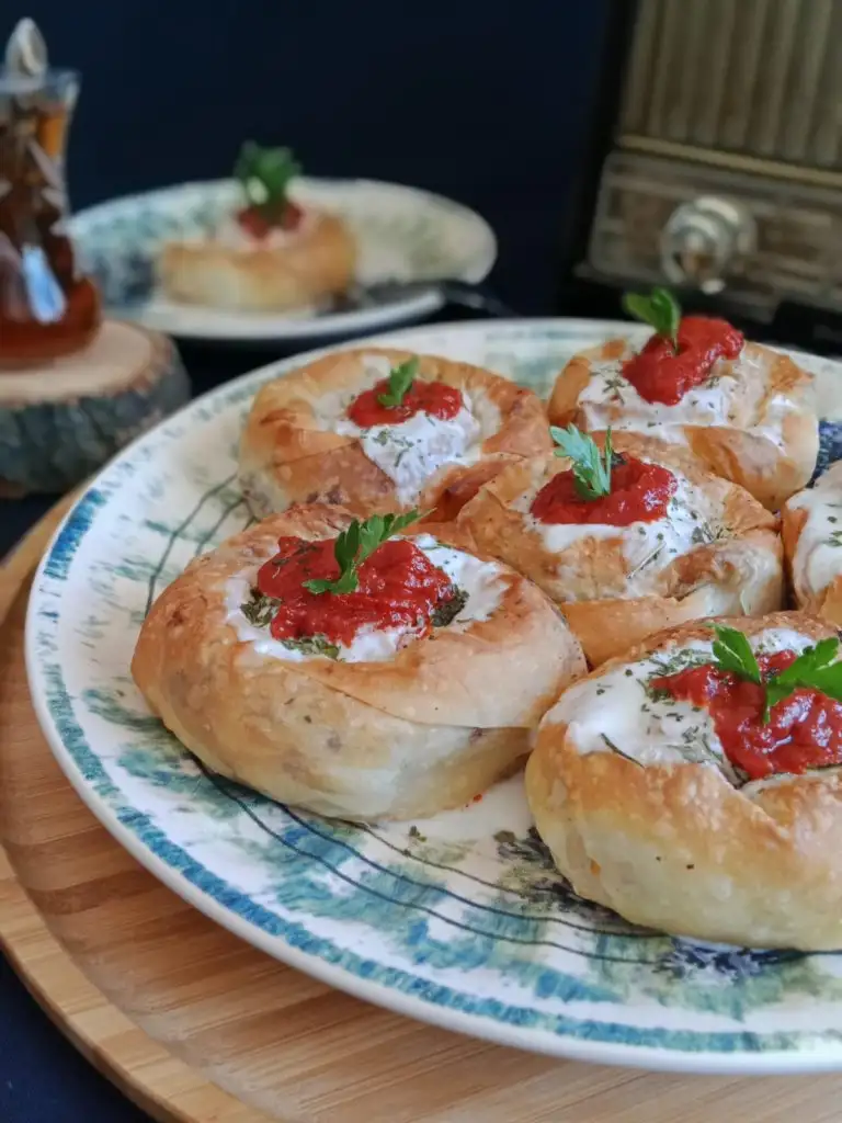 Fırından çıkan böreklerin ilk sıcağı çıktıktan sonra üzerine önce yoğurt(tercihen süzme ve sarımsaklı)