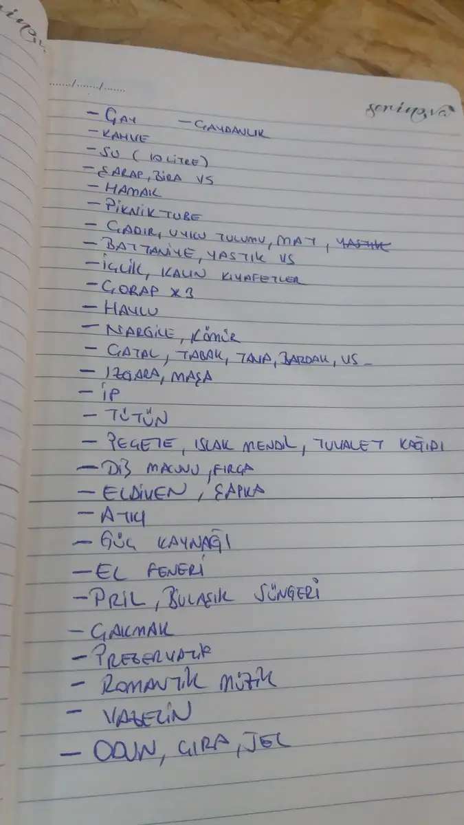 Sen ıssız adaya düşsen yanına alacağin 3 şeyi götür gerisini boşverbildigin kamp listesi alkol ve sigara eklenmis ben de listede kelepce jop falan mi var acaba dedim cok heycanlisin ilk kamp deneyimin her seye hazirlikli ol yarasalar icin sarimsak yazmamislar tavsiyem onu da yanina al Allah baska dert vermesin