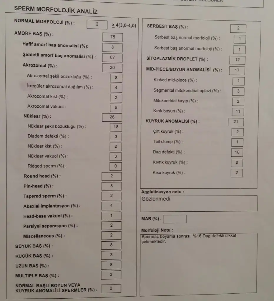 Kaan aydosta 9 ay tedavi gördük sperm dna hasarı düştü ancak oksidatif stres ve artan sperm yaşlanması cıktı son testte ancak buna ragmen bitirdi tedaviyi. Antioksidan kullandık. İğne kullanınca yükseldi hasar klomen kullanınca sabit kaldı antioksidanla düştü ve tedavi bitti. Nisanda bitince tedavi biz haziranda tüpr başladık. Eşimde şiddetli baş anomalisi var yzde 96. Ayrıca sperm hızı da yavaş. O yüzden imsi istedik başı normaller secilebilsin diye. Ayrıca mikroenjeksiyon oldu mikrocipteki gibi yüzecek engelleri aşacak hızı yok spermlerinin. Sonuc ilk denememizde 13 yumurtam toplandı 11i döllendi. 6sı 5.güne geldi. Biz pgt de istedik embriyolara ve 3 ü bozuk 3 ü sağlam geldi. Sağlamlardan biri içimde diğer ikisi de bizi bekliyor memorial şişlide. Bana gelince benim prolaktin sıkıntım vardı tedaviye baslamadan dostinexle kontrol altına alıp gittim. Yumurta toplanana kadar da ictim ilacı. Rahim dinlendirme ve trnasfer sürecinde kestim. Bu şekilde hikayem:)