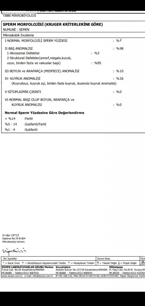 Bizde gittik canim ilk olarak y gen diye bi labaratuvara gönderdi 800 tl ye test yapilfi 1 ay kadar bi zaman sonra sonuclar cikti ama yüzde olarak bisey yazmiyodu doktor sadece hasar var dedi 3 aylik ilaclardan sonra düzen labaratuvara gonderdi tekrar test yaptirdik şuan sonuclarin çıkmasını bekliyoruz acikcasi ilk gönderdiği labaratuvar bana sacma geldi sonuclari ne tahlili olduğu yüzde hasarı falan hicbirsey yazmıyo bakalim diger sonuclar nasil gelecekMerhaba arkadaşlar bi konuda fikrinizi almak istiyorum yardımcı olursanız sevinirim. Dna hasarı için Ankaraya Kaan aydosa gitmeyi düşünüyoruz. Tahlilleri kendi kliniğinde mi yaptırıyor yoksa farklı bir hastaneye mi gönderiyor.