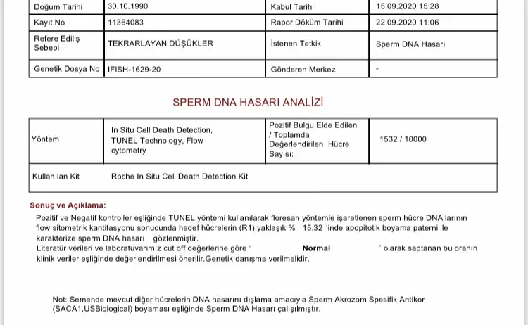 Arkadaşlar merhaba 2 düşükten sonra eşimin 3.seviye varikoseli olduğu için bi dna hasar testi yaptırmamız gerektiği söylenmişti yaptırdık sonuçlarımız ekte. Anlayan varsa yorum yapabilir mi ? Doktor randevumuza daha çok var