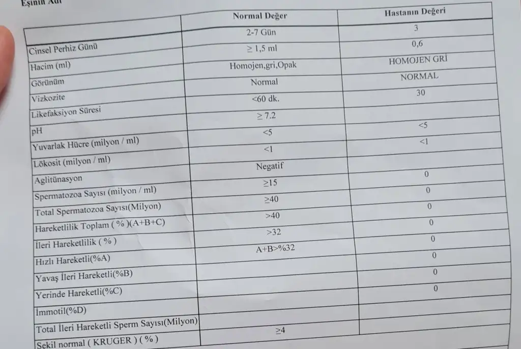 teşekkür ederim,Değerlerin sıfır olması bakılmadığı anlamına gelmiyor sperm olmaması anlamına geliyor. Sıfır olması zaten incelenecek sperm olmaması demek. Toplam sperm sayisi sıfır yani.. doğal olarak diğer morfoliji hareketlilik vs de sıfır. Neden sperm olmadığı araştırılıp tedavi olmalı . Ardından sperm olursa tüp bebege geciliyor. Çok iyi laboratuvarı olan bir tup bebek merkezinde 2. Testi verip doktor ile görüşmenizi öneririm. . Benim eşim de azosperm hastası. Sperm olmama durumu Tıkanıklıga bagli olabilir. (Volum dusuklugu) , Hormon dusuklugu veya yuksekligi olabilir veya genetik olabilir. Allah yardimcimiz olsun